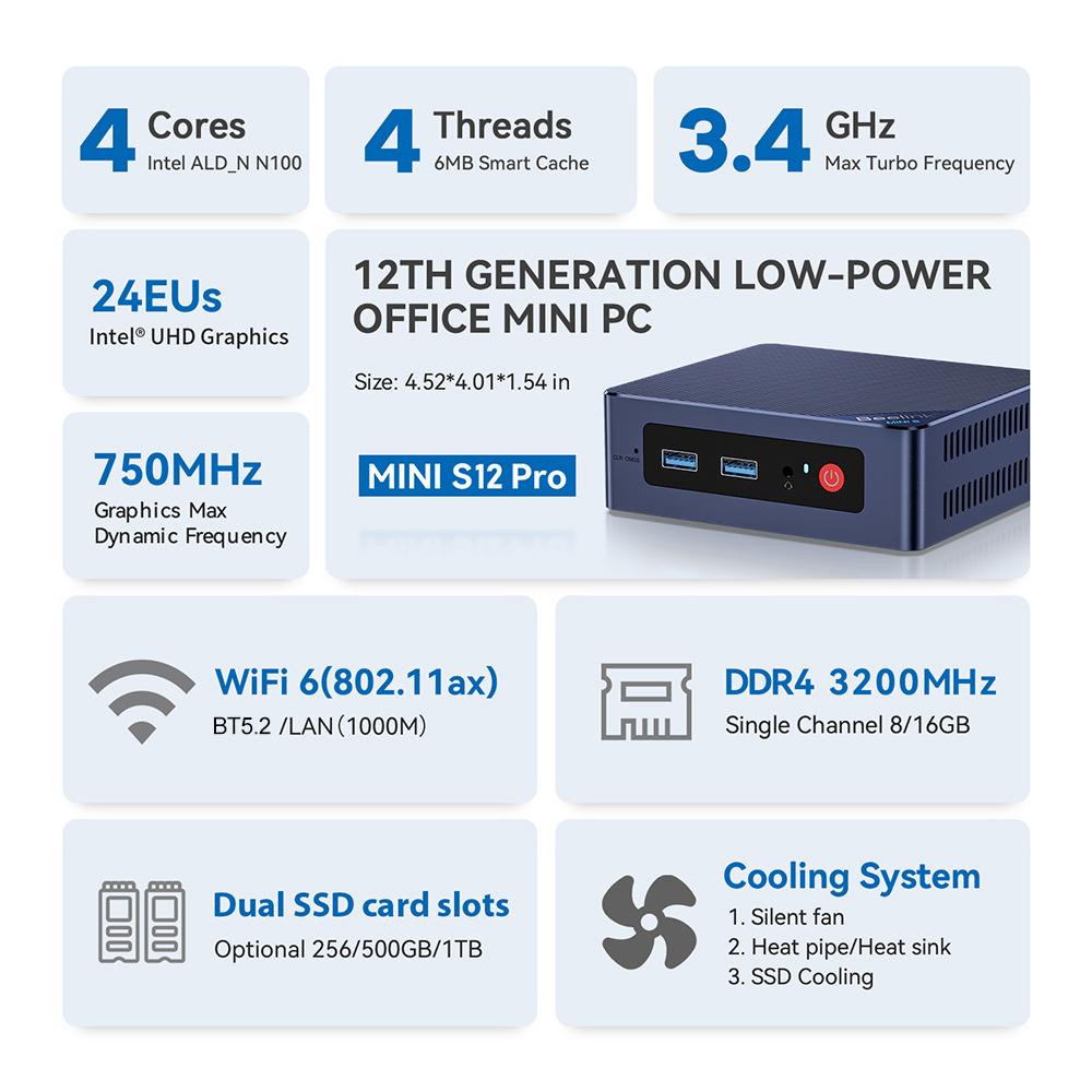 Beelink Мини-ПК Min S12 Pro N100 Win11 Pro Поддержка 4K Wifi6 1000M LAN Настольный мини-компьютер