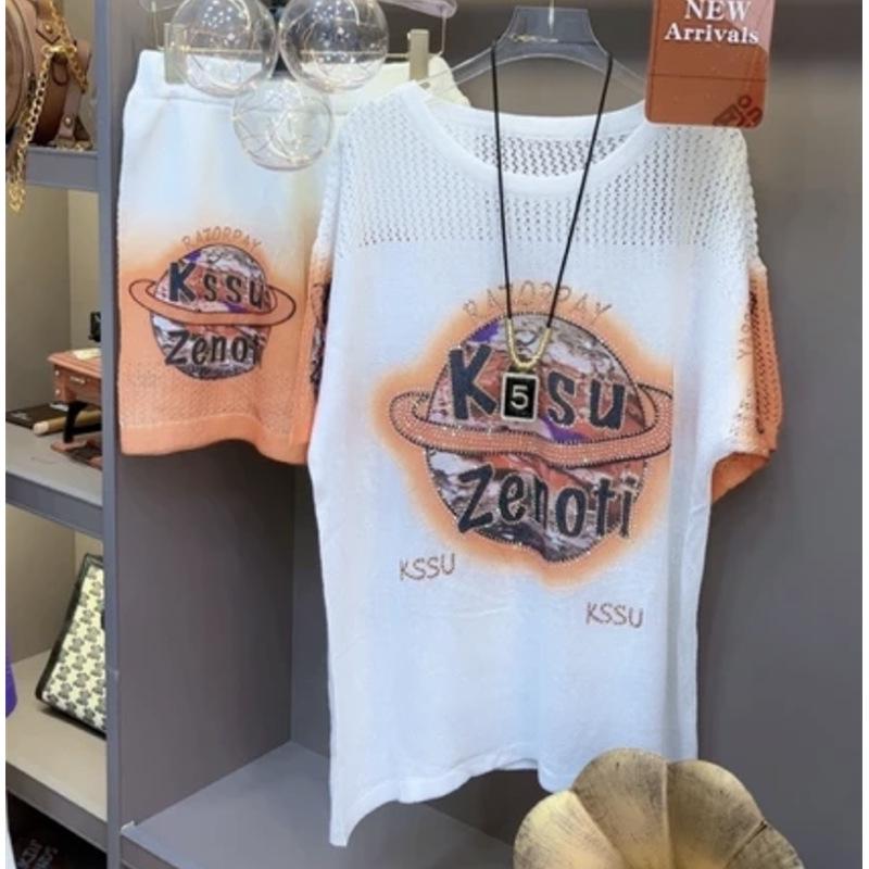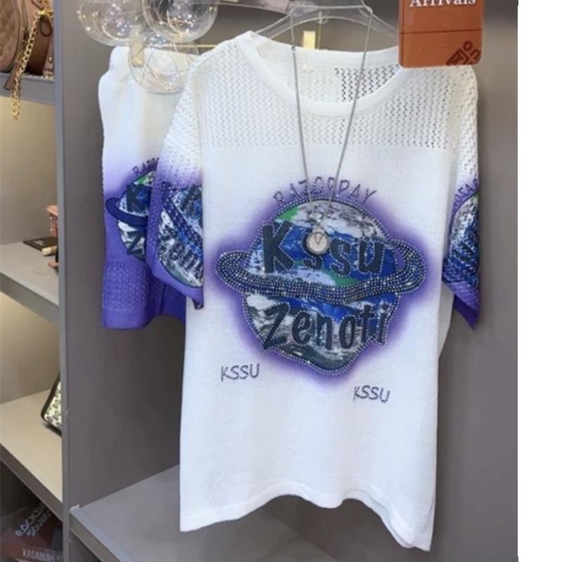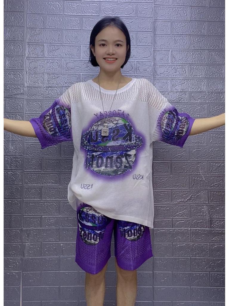 2025 Европейский стиль Летний трикотажный комплект из ледяного шелка с мультяшным принтом: Женский повседневный костюм-двойка с вырезами и горячей отделкой