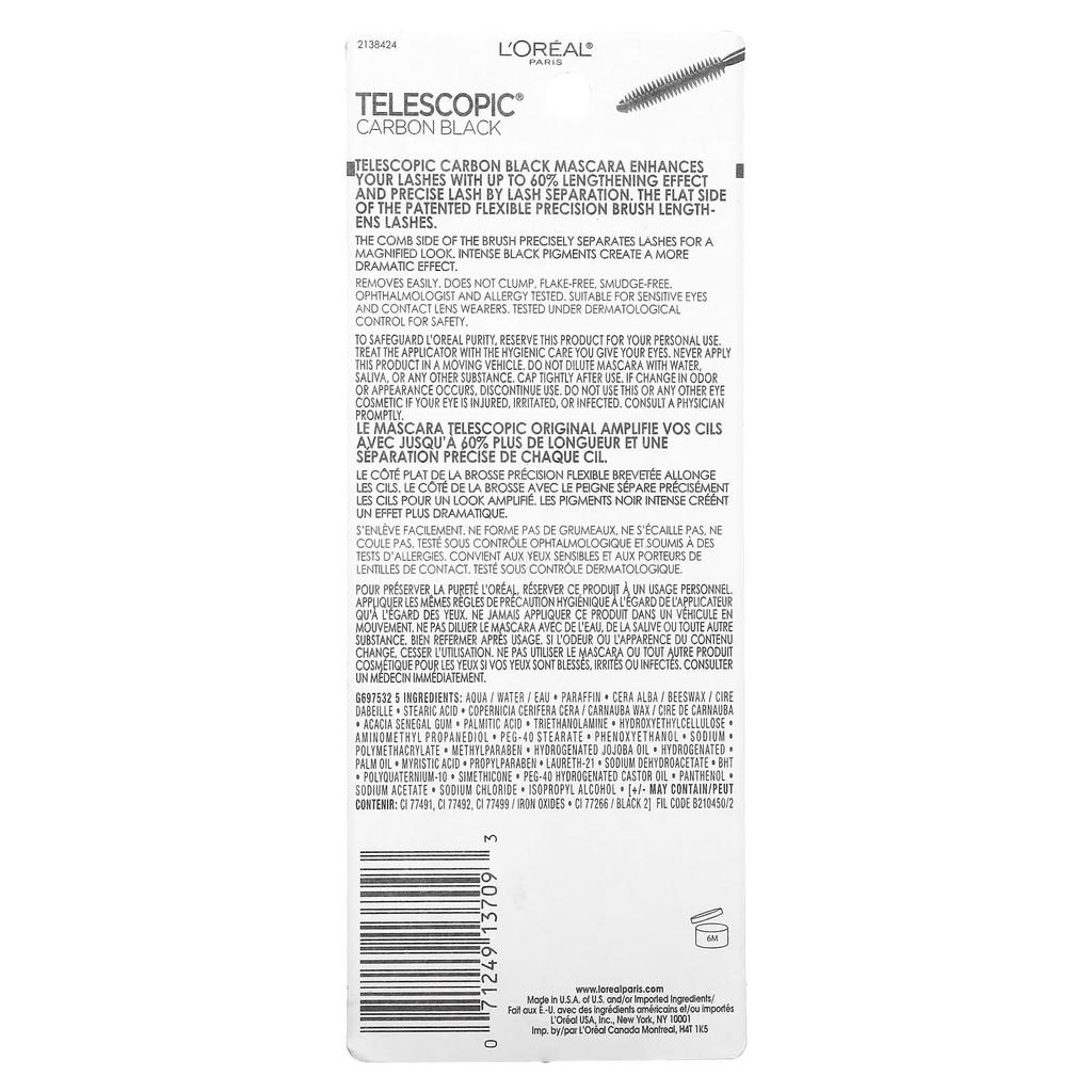 Описание товара: Тушь на 2 тона темнее*Тушь, которая значительно удлиняет ресницы*Точная запатентованная кисточкаПротестировано офтальмологом и на аллергиюЛегко смывается мылом и водойТакже подходит для контактных линз и чувствительных глазБез отдушекТушь L'Oréal Telescopic Carbon Black значительно удлиняет и затемняет ресницы. Как это работает: Изысканная запатентованная щеточка удлиняет ресницы до 60%, а эксклюзивный пигмент Carbon Black обеспечивает в 2 раза более насыщенный цвет.*В два раза более пигментированный, чем стандартный черный от L'Oréal.