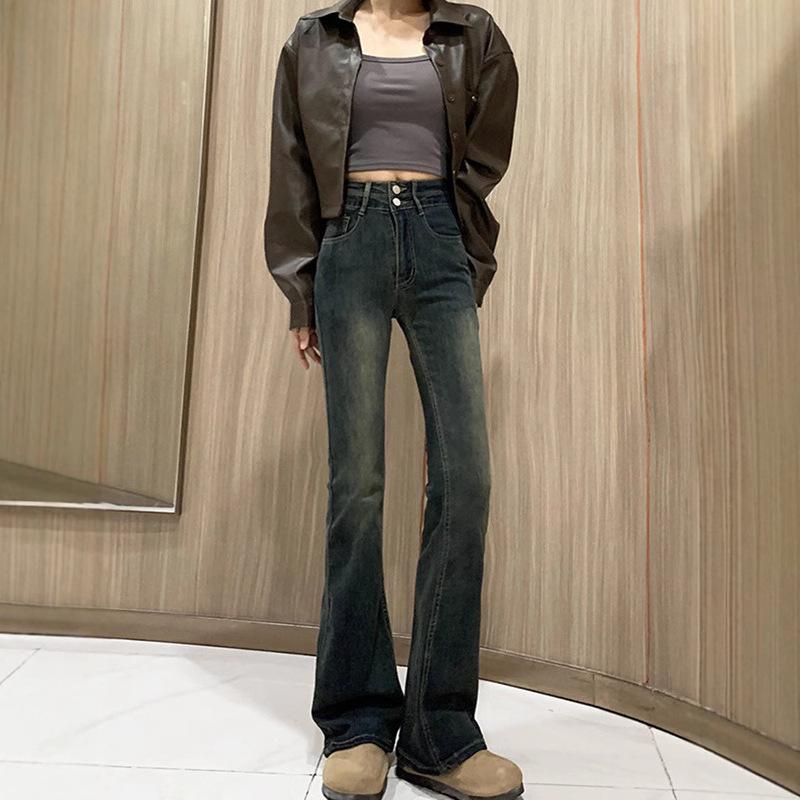 Цементно-серые женские джинсы с высокой посадкой в стиле ретро, расклешенные от колена, удлиненные, от маленьких до больших размеров, для весны и осени.