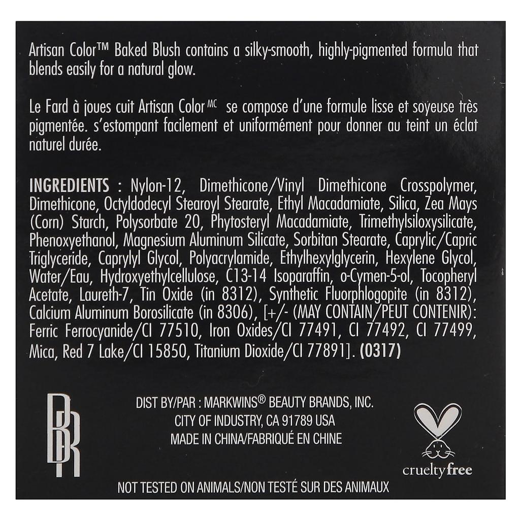 Product Description: Cruelty FreeNo Animal TestingArtisan Color™ Baked Blusher has a silky smooth, highly pigmented formula that blends easily for a natural glow. Ingredients: Nylon-12, Dimethicone/Vinyl Dimethicone Crosspolymer, Dimethicone, Octyldodecyl Stearoyl Stearate, Ethyl Macadamiate, Silica, Corn (Zea mays) Starch, Polysorbate 20, Phytosteryl Macadamiate, Trimethylsiloxysilicate, Phenoxyethanol, Magnesium Aluminum Silicate, Sorbitan Stearate, Caprylic/Capric Triglyceride, Caprylyl Glycol, Polyacrylamide, Ethylhexylglycerin, Hexylene Glycol, Purified Water, Hydroxyethyl Cellulose, C13-14 Isoparaffin, O-Cymen-5-ol, Tocopheryl Acetate, Laureth-7, Tin Oxide (in 8312), Synthetic Fluorphlogopite (in 8312), Calcium Aluminum Borosilicate (IN 8306), [+/- (Possible Containments): Ferric Ferrocyanide/CI 77510, Iron Oxides/CI77491, CI77492, CI 77499 Mica, Red No. 7 Aluminum Lake/CI15850, Titanium Dioxide/CI77891].