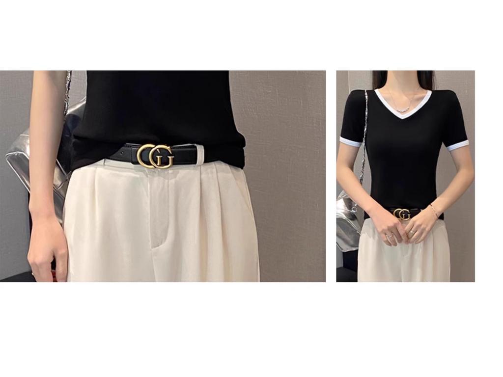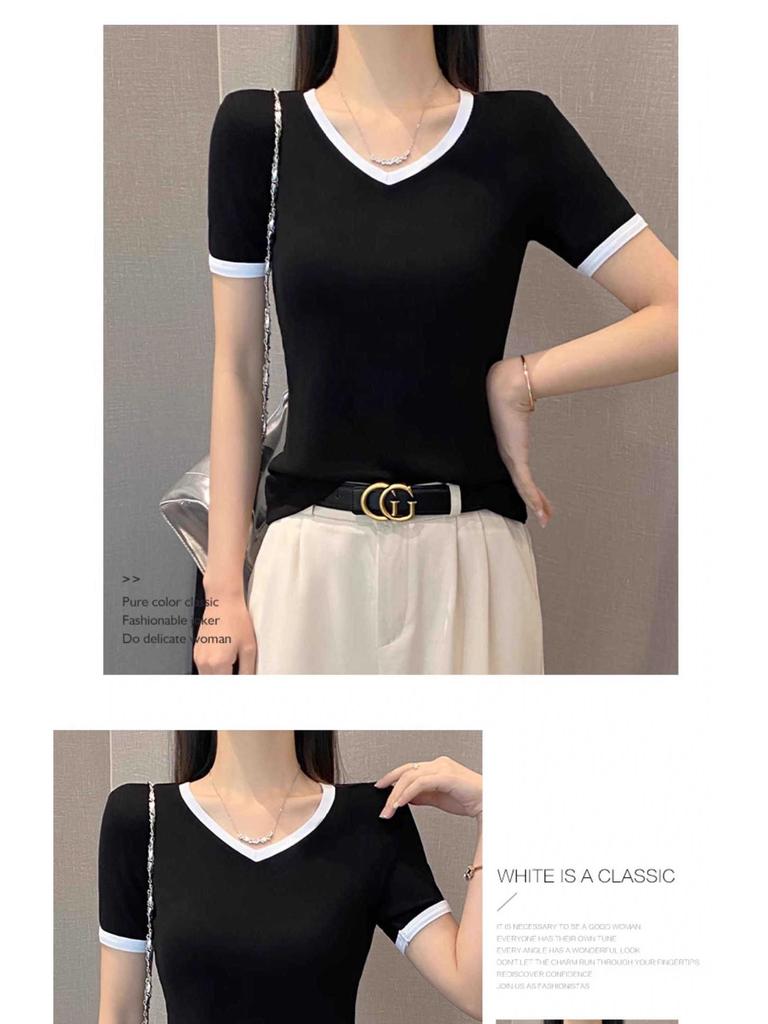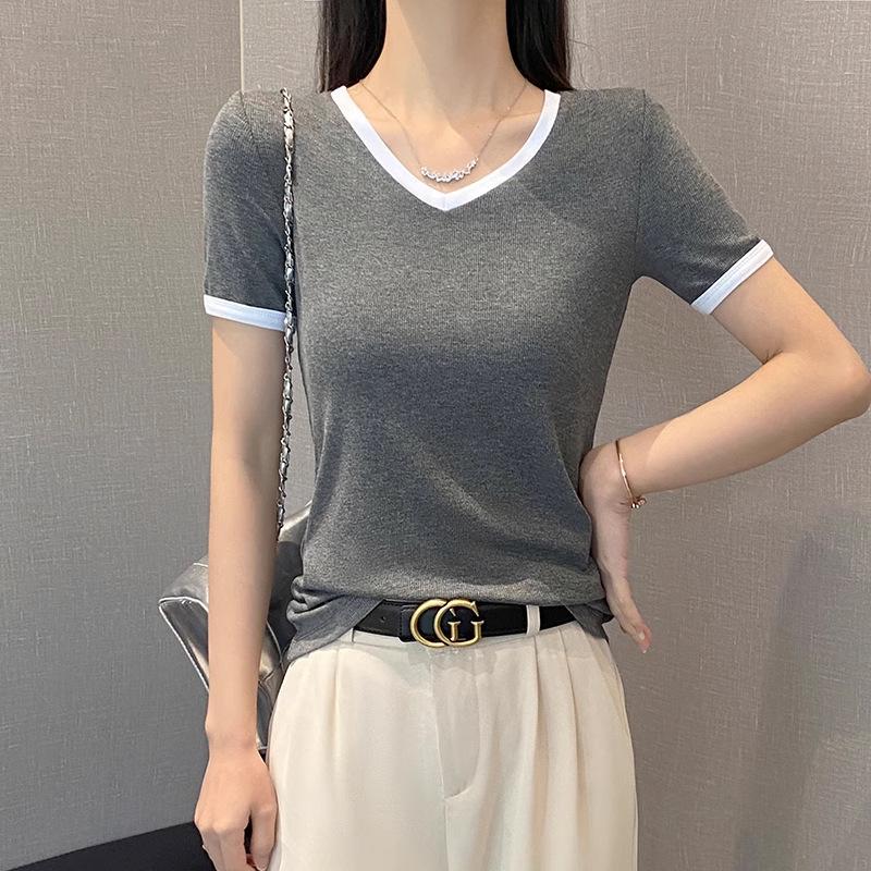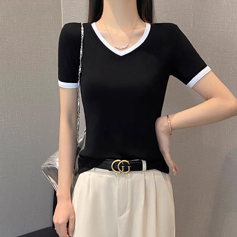 Женская футболка с V-образным вырезом, цветными блоками и короткими рукавами, весна/лето 2025, приталенный крой, прямой плечевой шов, низкий вырез горловины, модный нишевый дизайн