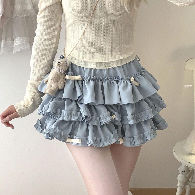 Мини-юбка с бантом для женщин Каваи Милая юбка-торт с оборками Шорты для девочек Харадзюку Одежда в японском стиле