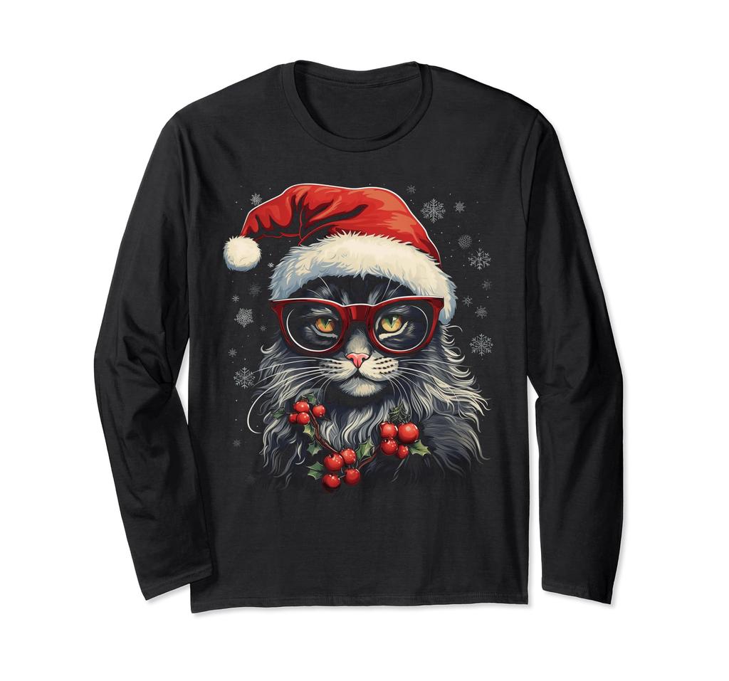 Рождественский кот Рождественский котенок Шапка Санта-Клауса Праздничная одежда Футболка с длинным рукавом