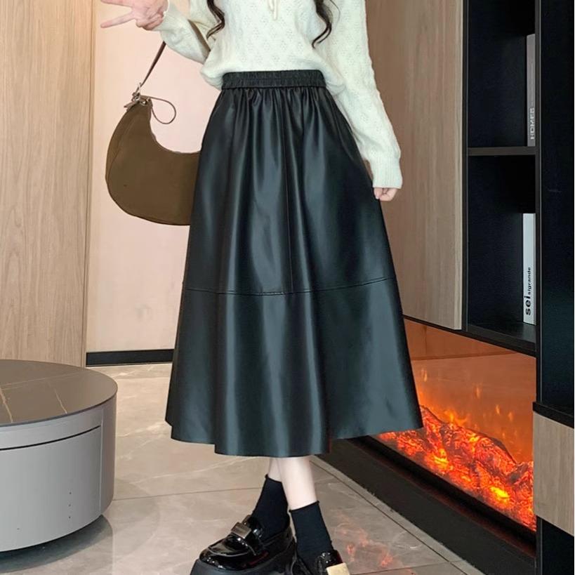 Женская юбка А-силуэта из искусственной кожи ПУ средней длины 2024: Осень/Зима Мода, Эластичная Талия, Универсальный Темперамент, Свободный Крой Дизайн «Зонтик»
