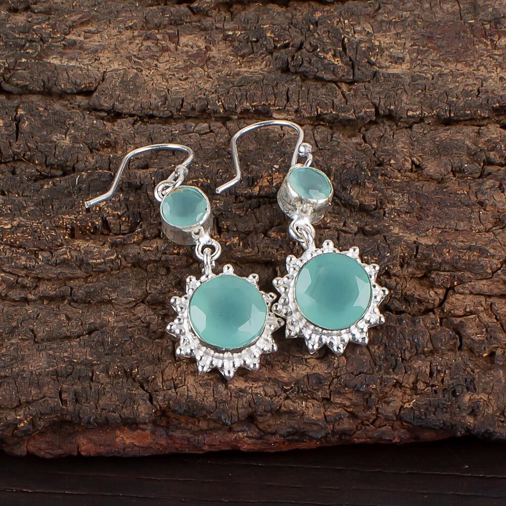 Аква Халцедон Драгоценный Камень 925 Стерлинговое Серебро Ювелирные Изделия Серьги Подвески 1.80" EE-13-16