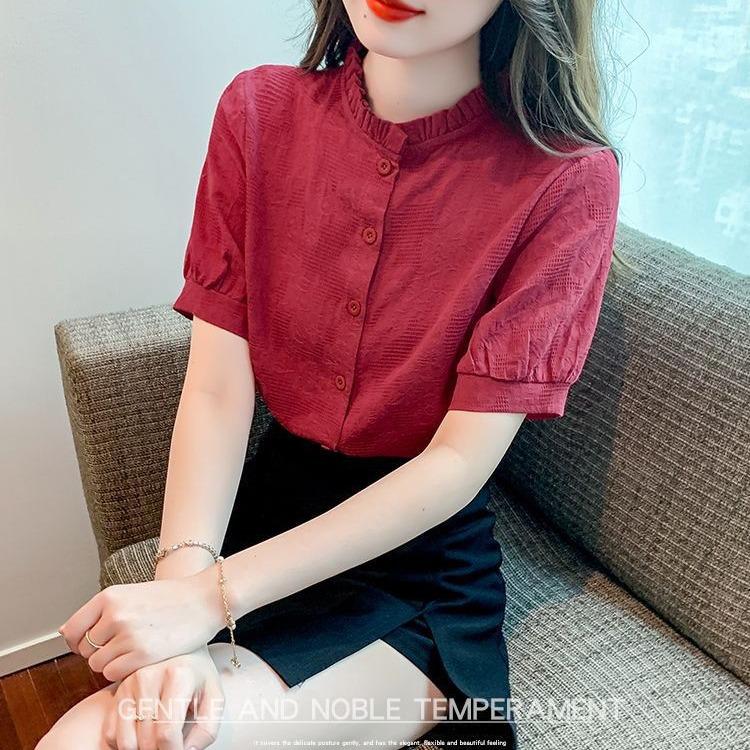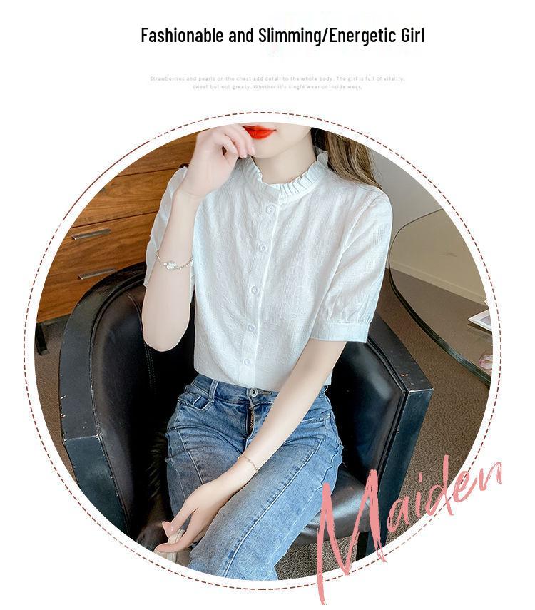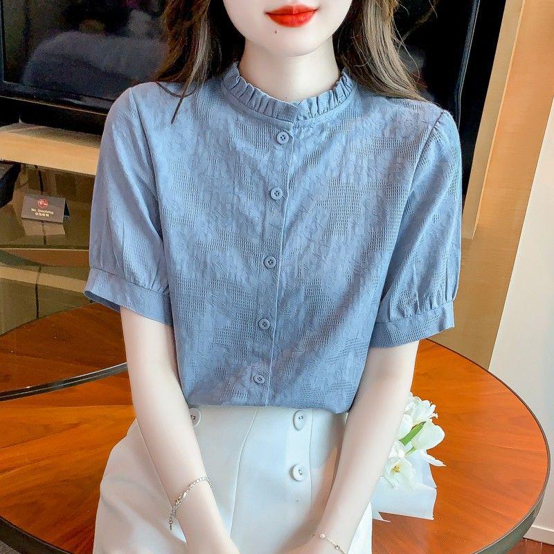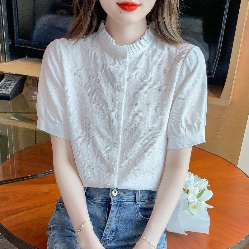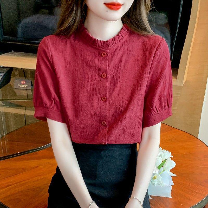 Пополните свой гардероб этой женской рубашкой из чистого хлопка с жаккардовым узором, не стареющей, созданной для элегантности и универсальности.. Этот топ, изготовленный из хлопка премиум-класса, обеспечивает воздухопроницаемость и комфорт в теплые летние дни.. Однотонный узор придает вневременную привлекательность, а короткие рукава обеспечивают ощущение свежести.. Эта рубашка, разработанная с изысканным воротником-стойкой, органично сочетает в себе стиль и функциональность, что делает ее идеальным выбором для любого случая.