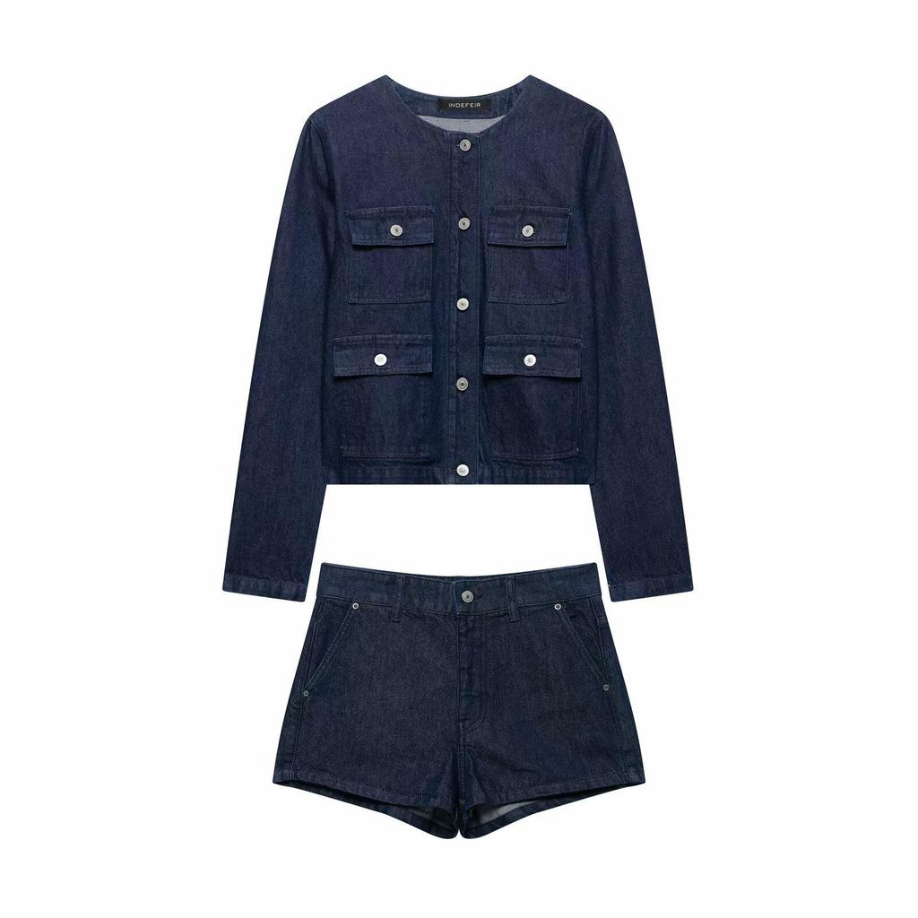 Пополните свой летний гардероб этим стильным женским модным джинсовым комплектом с карманами: курткой и шортами. Созданный для комфорта и шикарного вида, комплект включает в себя модную куртку, украшенную функциональными карманами, идеально подходящими для хранения необходимых вещей под рукой.. Этот легкий ансамбль, изготовленный из высококачественного полиэстера, идеально подходит для прогулок в теплую погоду, обеспечивая как долговечность, так и модный вид.. Собираетесь ли вы на прогулку в обычный день или на летнее вечернее мероприятие, этот универсальный комплект обещает сохранить ваш непринужденно крутой и модный вид.
