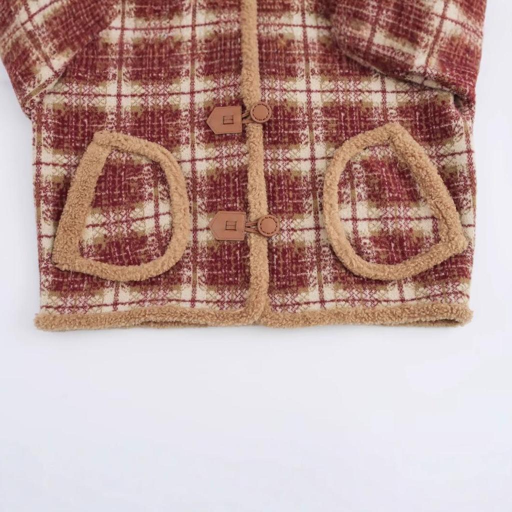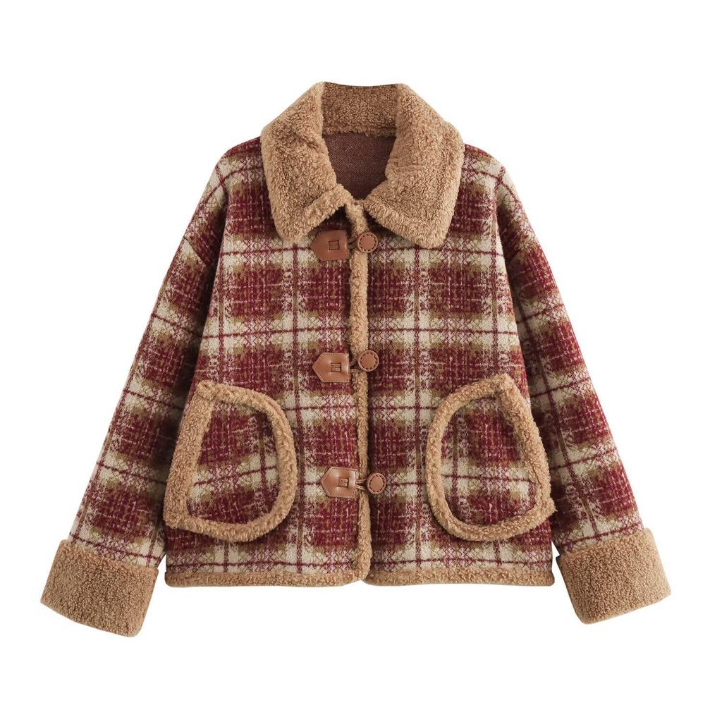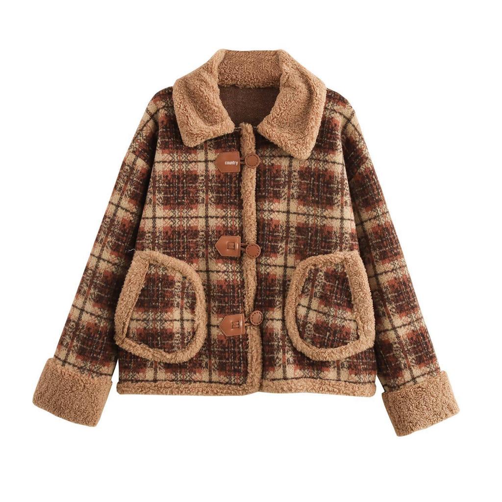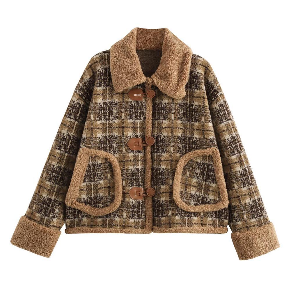 Женский трикотажный кардиган в клетку в европейском и американском стиле, осень 2024, с воротником и манжетами из овечьей шерсти