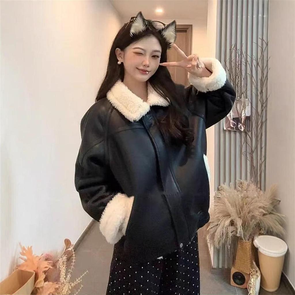 Женская дубленка в корейском стиле - Зима 2024, Толстая, Свободная, Универсальный верх с отложным воротником