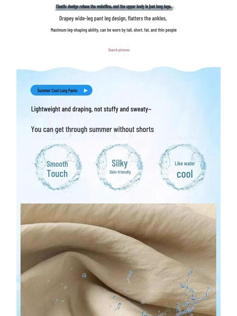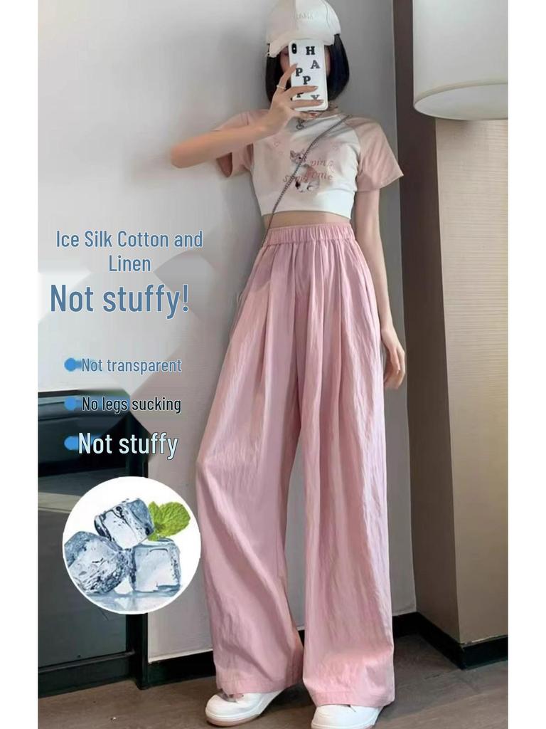 Experience ultimate comfort and style with these women's high-waist wide-leg pants, perfect for the summer season. Crafted from luxurious ice silk with a touch of spandex, these pants offer a breathable and stretchy fit that moves with you. The flattering pink hue and draping design create a chic and relaxed look, ideal for any petite figure. Embrace a sportive vibe while enjoying the elegance of loose-fit fashion.