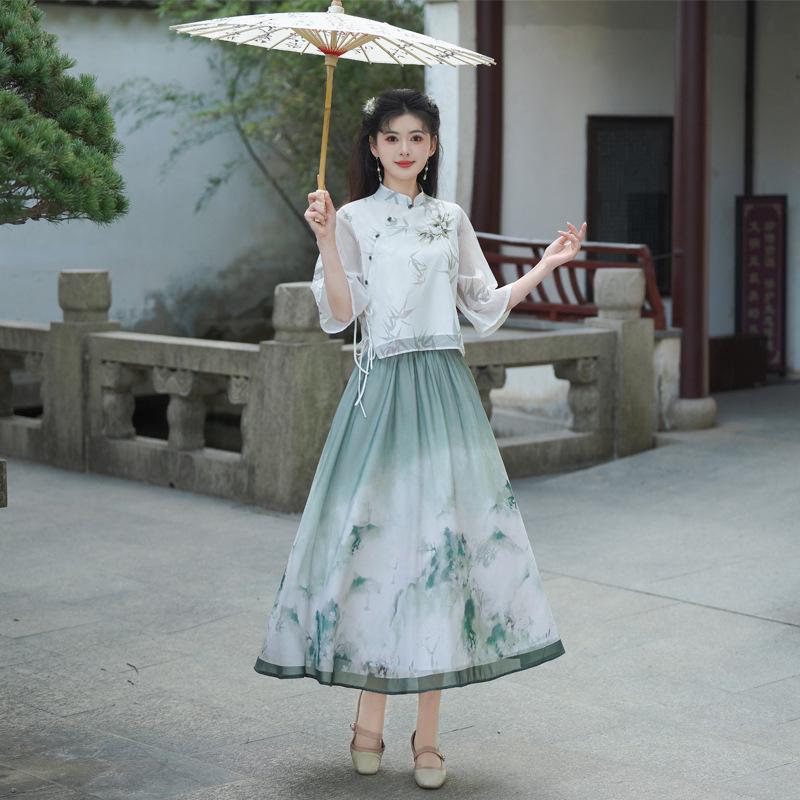 Ретро костюм в китайском стиле с принтом, воротником-стойкой, костюм Тан, ханьфу, ципао, топ и набор для чайной церемонии