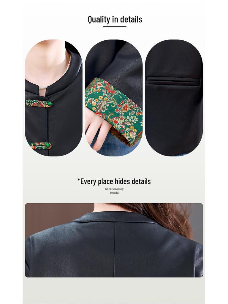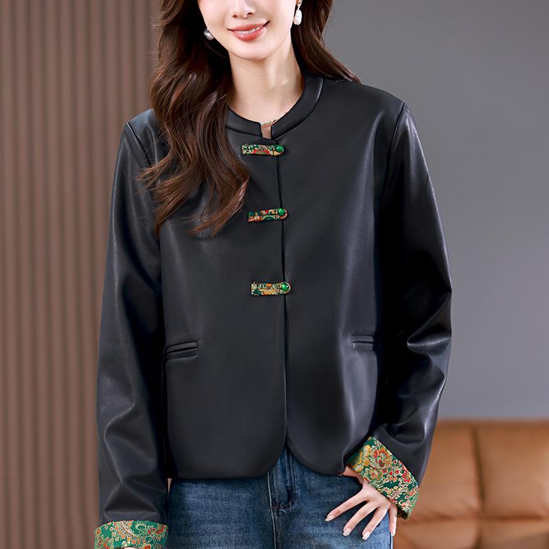 Женская кожаная куртка в китайском стиле на весну и осень с застежками-лягушками
