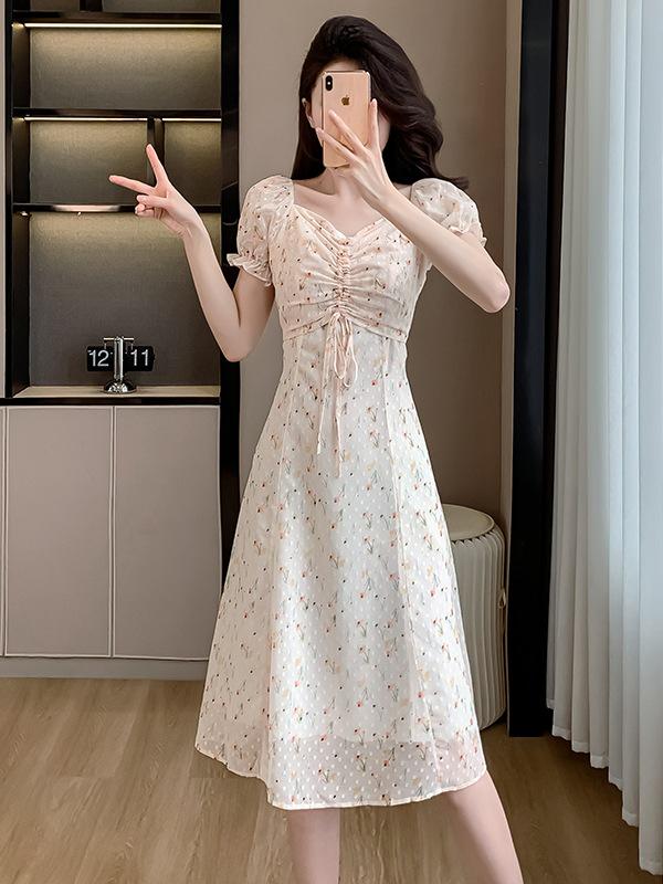 Французское милое цветочное шифоновое платье с квадратным вырезом для женщин