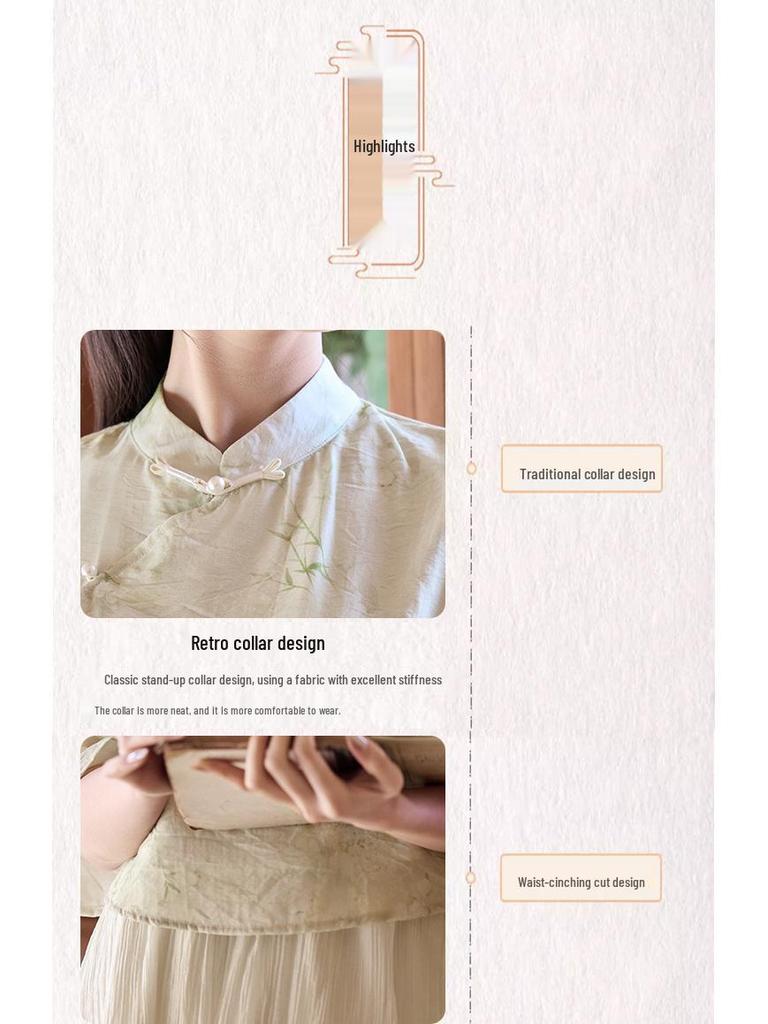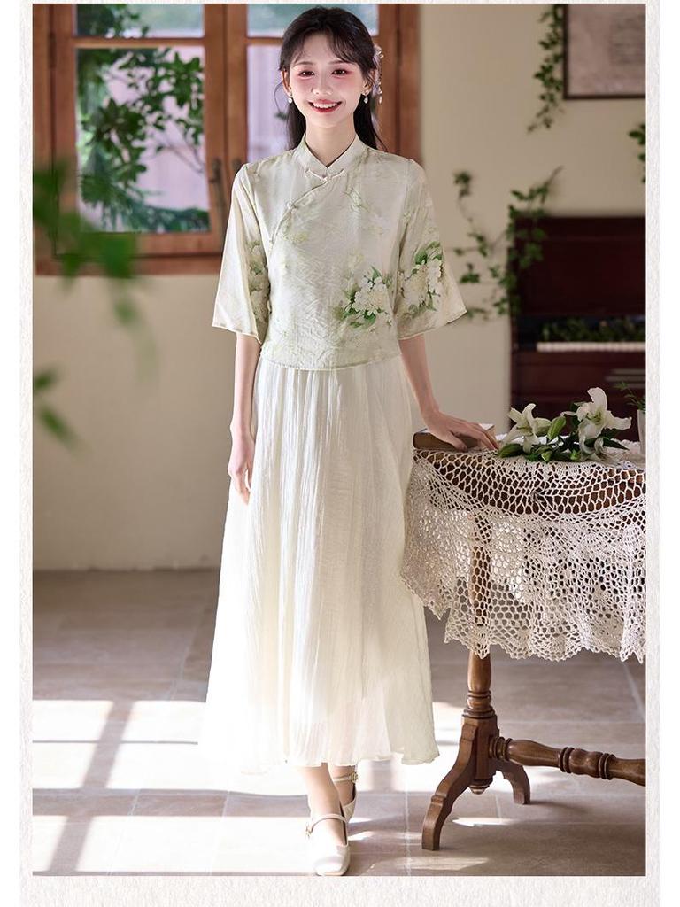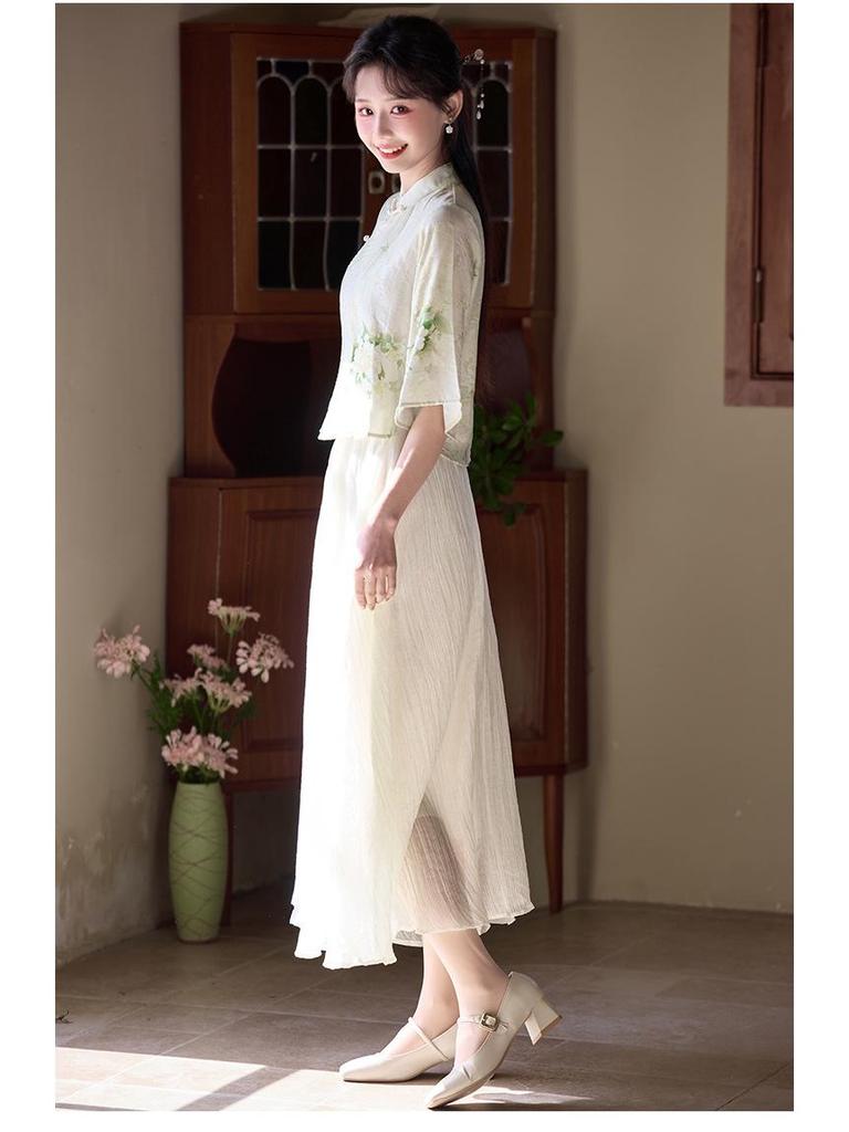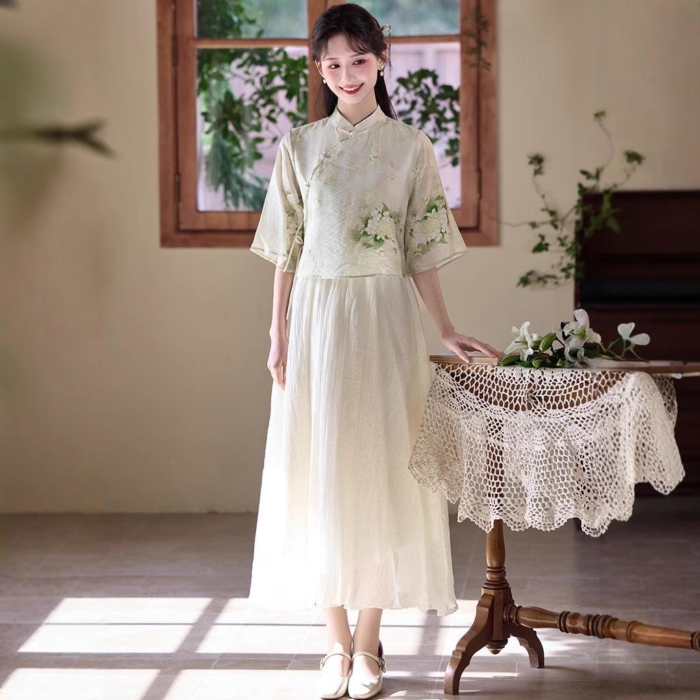 Летний китайский ретро костюм Тан с воротником-стойкой, ханьфу, ципао, топ и юбка