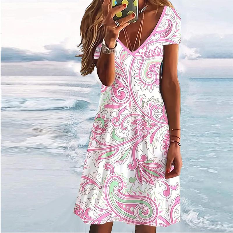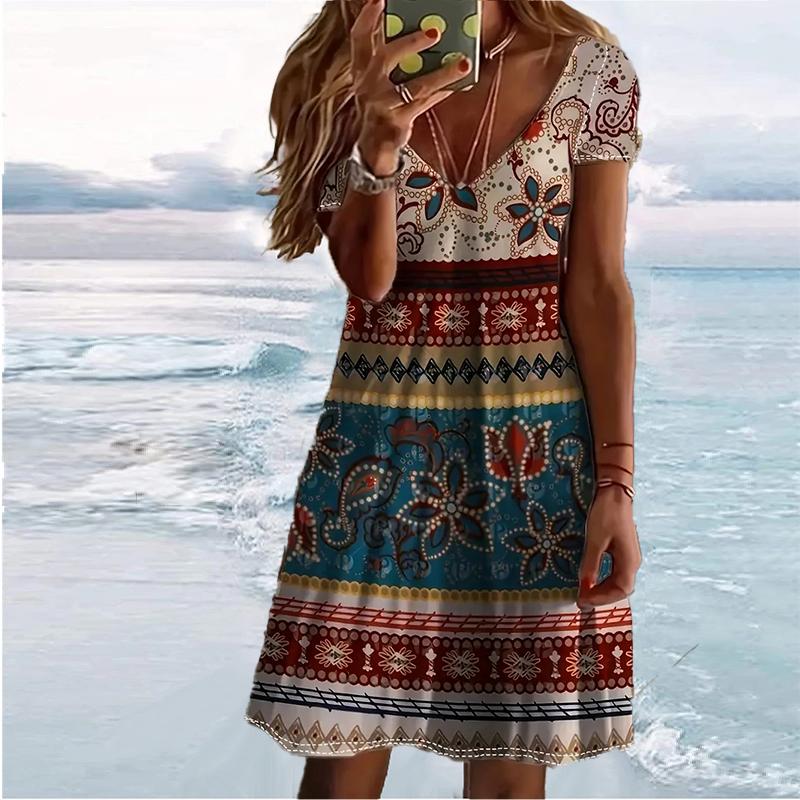 Летняя мода Женское платье с V-образным вырезом и коротким рукавом в стиле ретро с принтом Сексуальное короткое платье-юбка