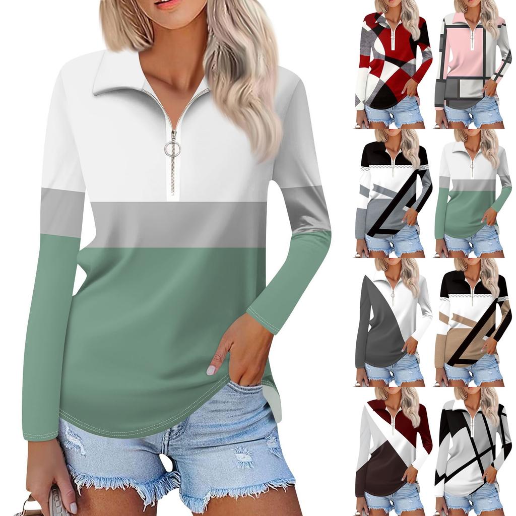 Женская весенняя и модная повседневная рубашка с принтом на молнии с V-образным вырезом и длинным рукавом