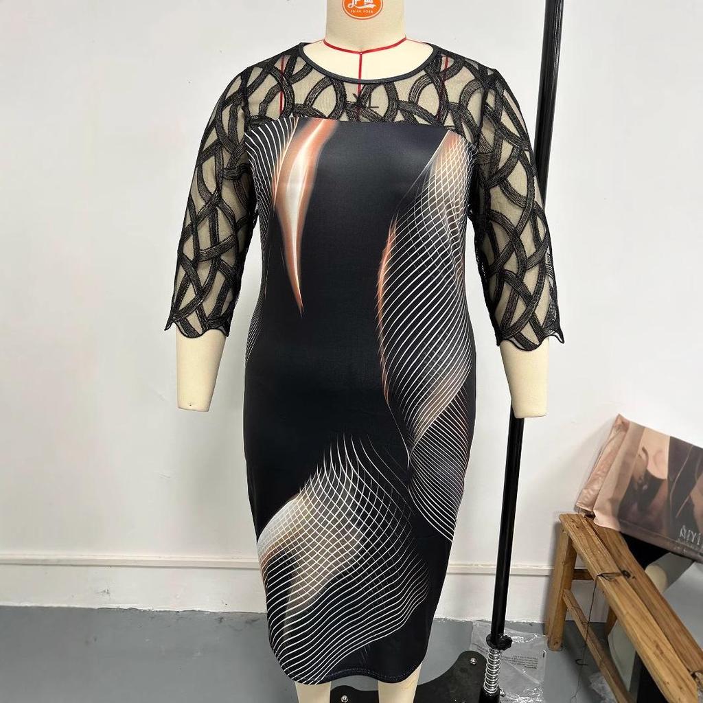 Европейское и американское женское повседневное платье бодикон большого размера с кружевной отделкой и случайным принтом, сексуальный дизайн с круглым вырезом