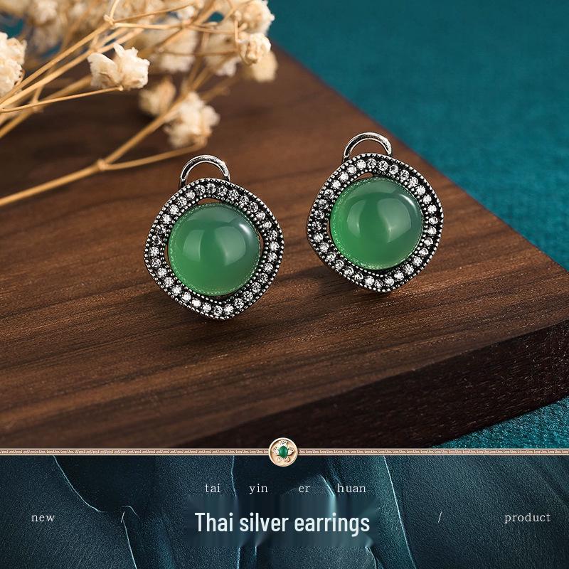 Тайское серебро, серьги-пусеты и клипсы с халцедоном в китайском античном стиле