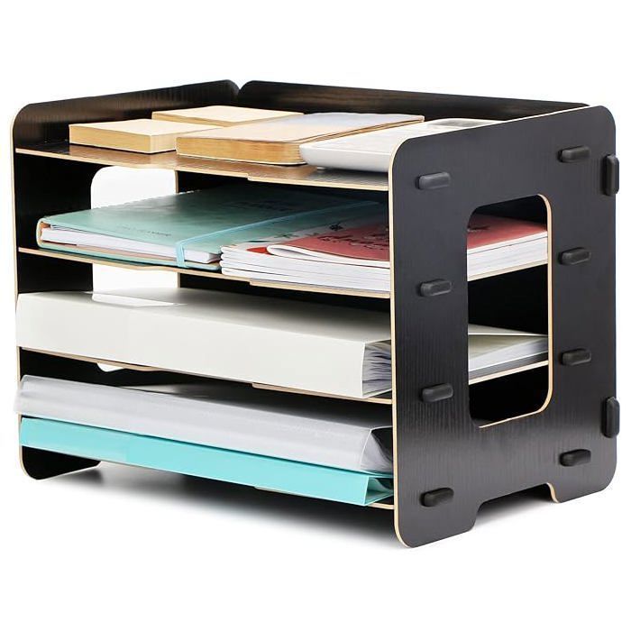 EXERZ Organiseur de fichiers en bois 4 niveaux pour bureau, fournitures, devoirs, documents, lettres, magazines – Couleur noire