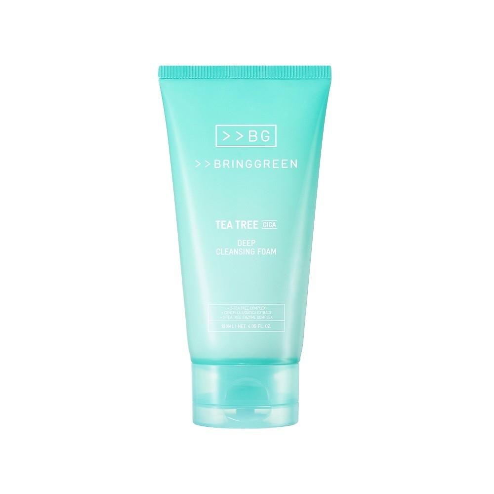 The BRINGGREEN Tea Tree Cica Deep Cleansing Foam 120mL helps purify and soothe sensitive skin with tea tree and cica ingredients. Its unique 5-layer tea tree complex deeply cleanses the skin and provides hydration, while leaving a refreshing sensation post-use.