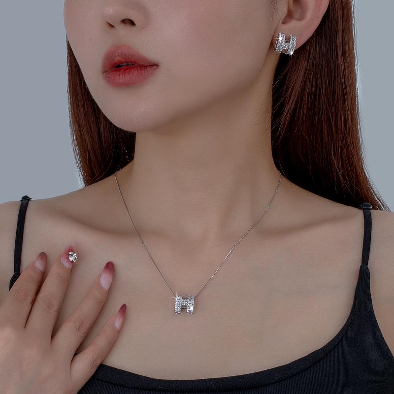 Новый сверкающий набор ожерелья и серег с буквой H из бриллиантов - Минималистичный корейский дизайн, цепочка для ключицы из белого золота