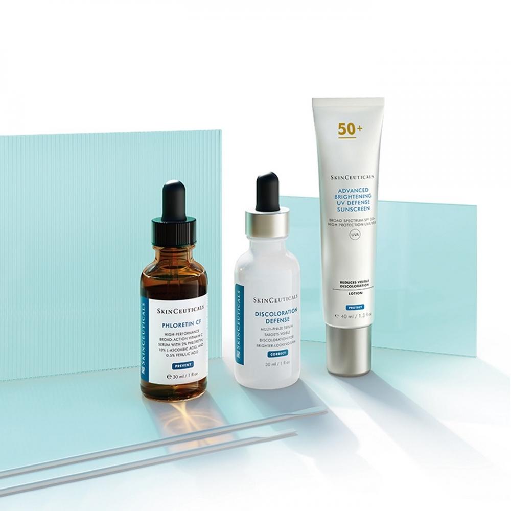 SkinCeuticals Discoloration Defense Serum: After cleansing, dispense 4-5 drops and apply gently to the face, massaging from top to bottom to ensure full absorption. It is recommended to use a daily sunscreen in conjunction with this product.