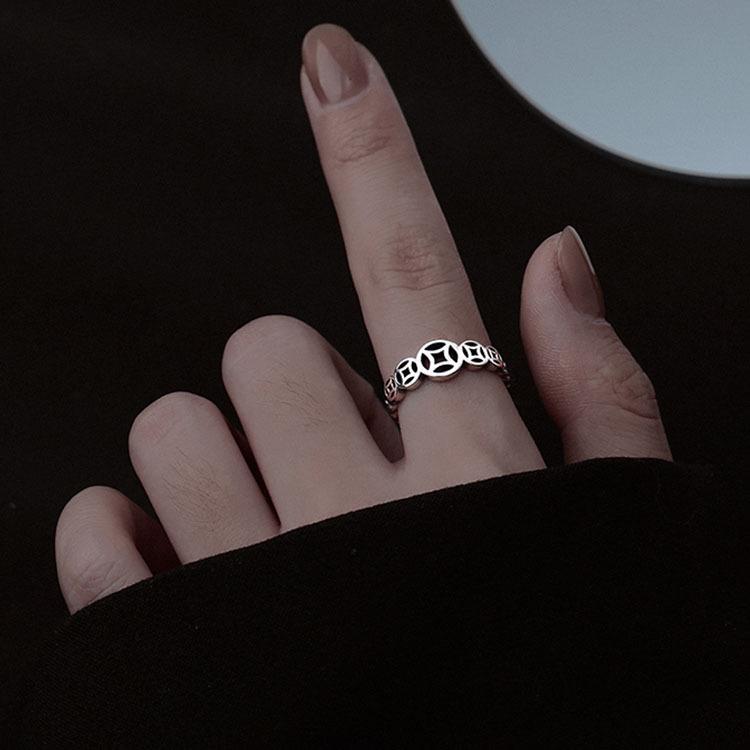 Кольцо открытое из стерлингового серебра 925 пробы, ретро, в виде медной монеты - в японском/корейском стиле, пять благословений, оксидированное покрытие