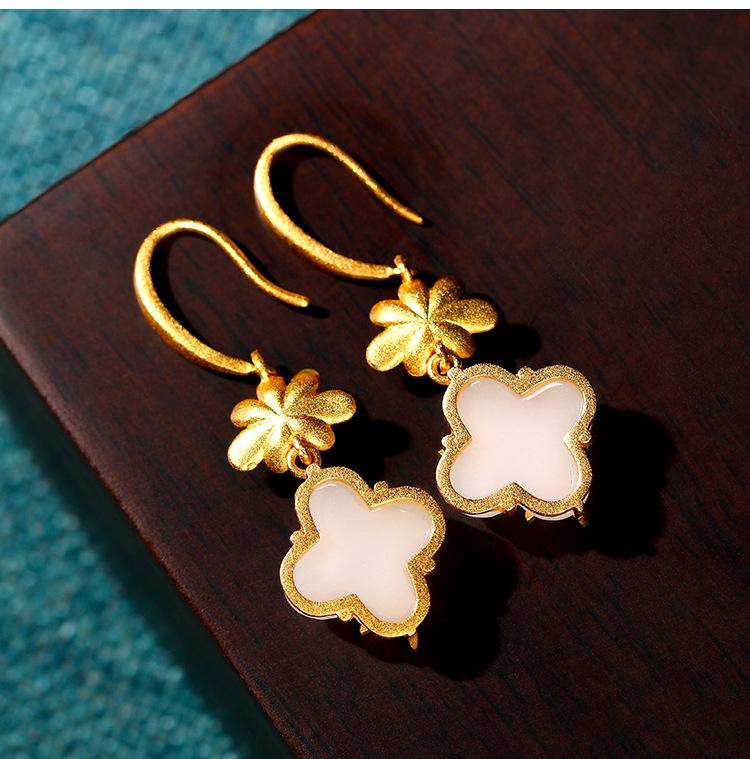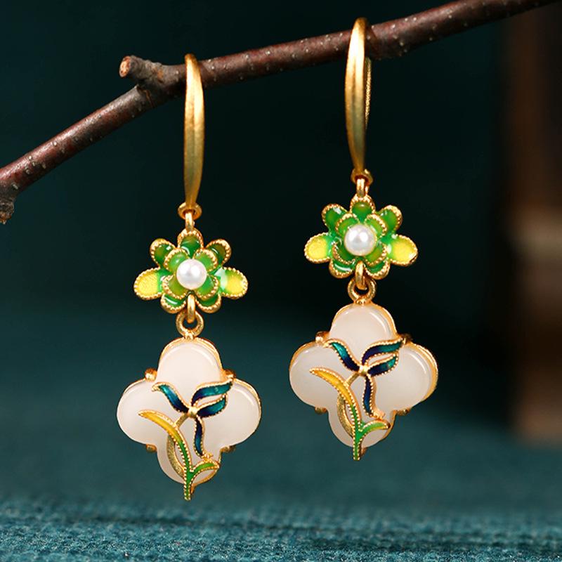 Рекомендованные инфлюенсерами китайские эмалевые серьги-клевер под нефрит