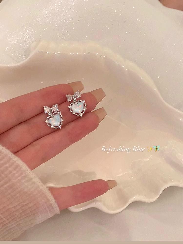 Милые серьги-бантики с цирконами в корейском стиле: Легкая роскошь, высококлассный дизайн с нежной подвеской-сердечком
