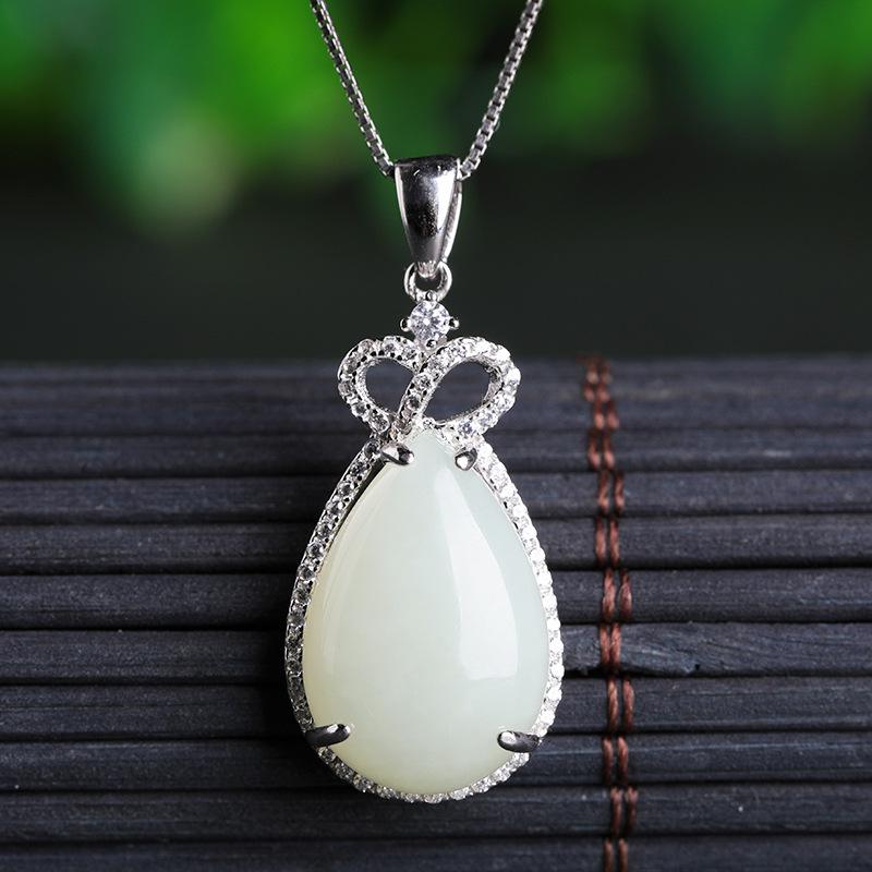 Hetian Jade Teardrop Pendant Necklace, Sterling Silver Crown Inlaid White Jade, Court Style Jewelry Gift for Women — купить товар онлайн с бесплатной доставкой до всему миру!