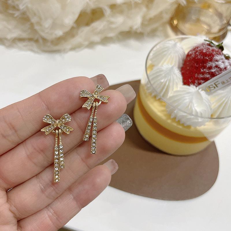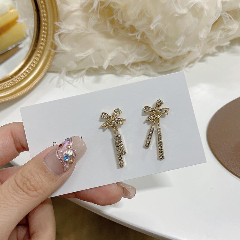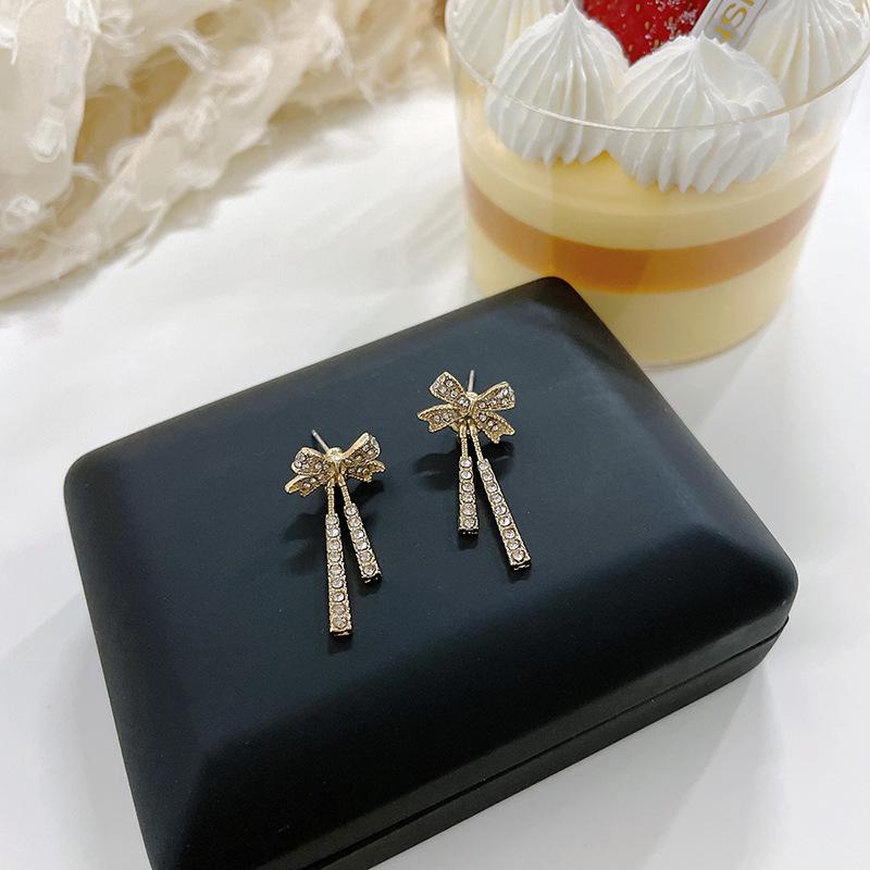 S925 Silver Bow Stud Earrings with Diamond, Long Dangle Style, Cold Trend Ear Clips for Women