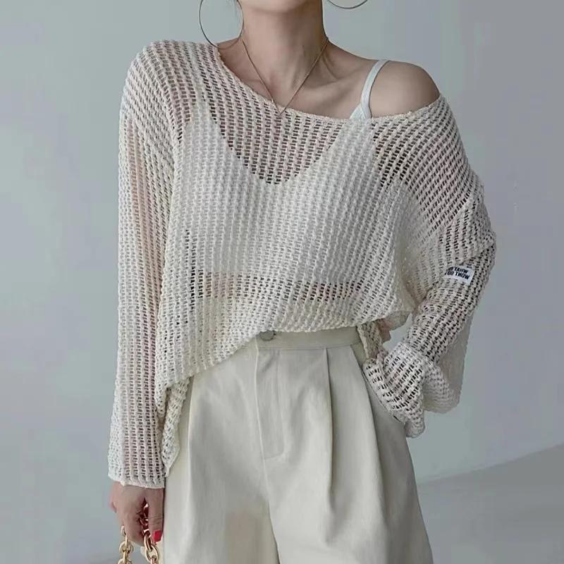 Летние женские вязаные свитера, женские сетчатые тонкие свитера с прозрачным эффектом, свободные топы с длинными рукавами, рубашка с солнцезащитным кремом — купить товар онлайн с бесплатной доставкой по всему миру!