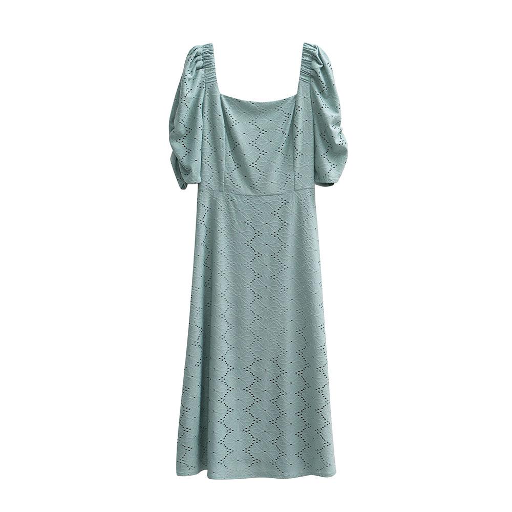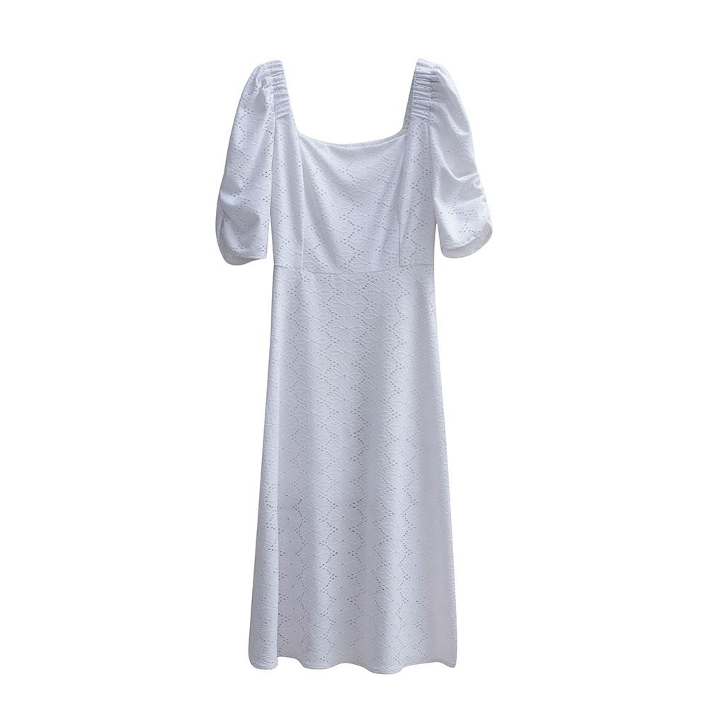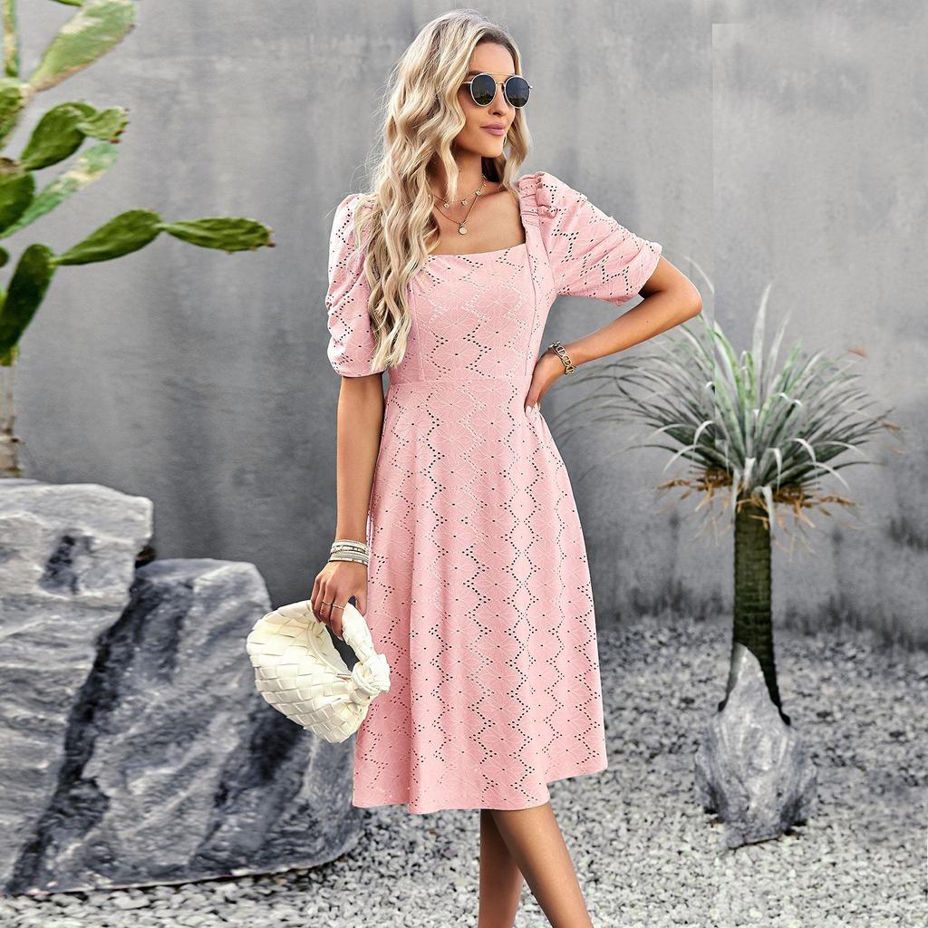 Сплошной цвет с квадратным вырезом женское летнее элегантное длинное платье с коротким рукавом и вырезом