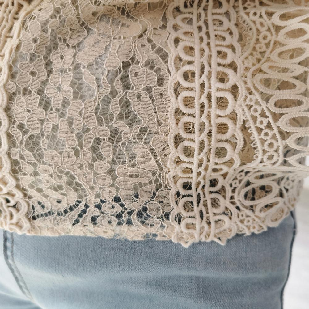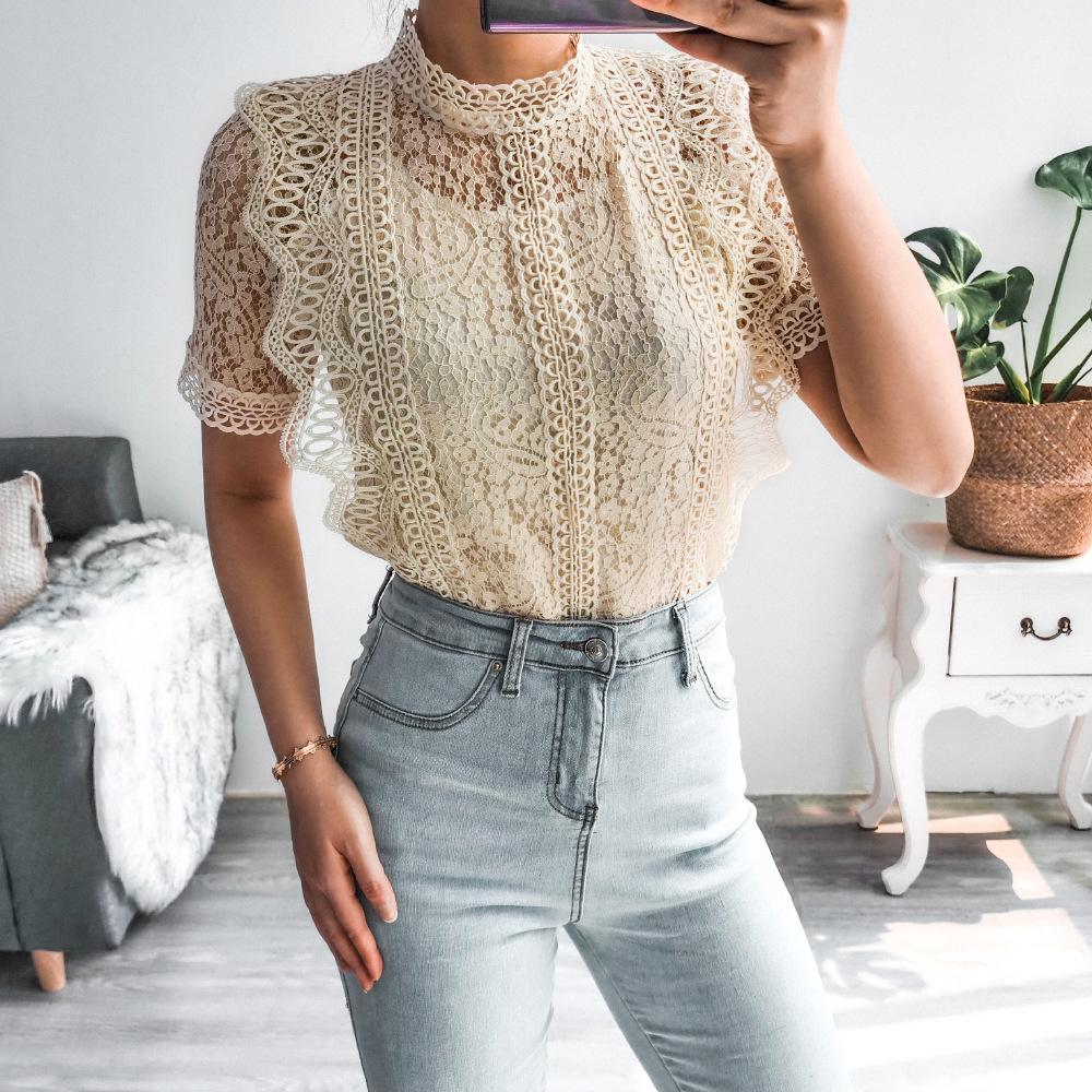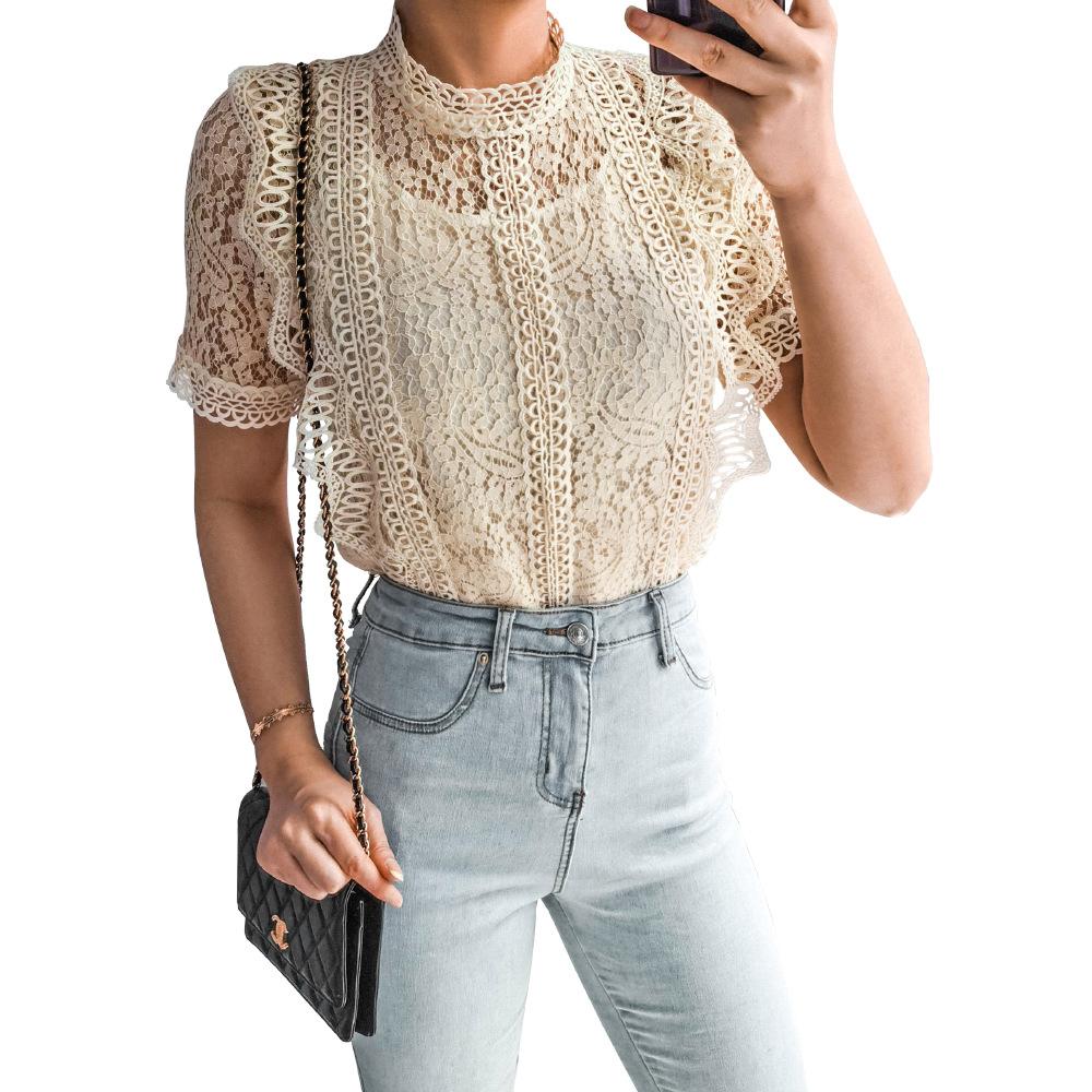 Летние вязаные крючком кружевные однотонные шикарные блузки с короткими рукавами и круглым вырезом