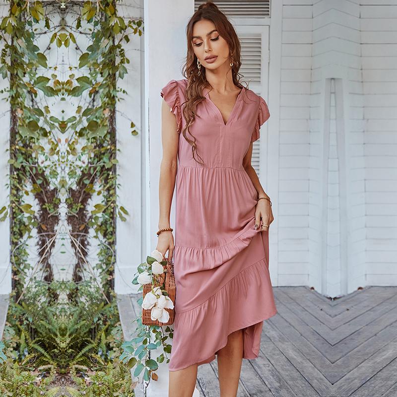 Весенне-летнее платье трапециевидной формы для отдыха и отдыха с V-образным вырезом, сексуальные однотонные платья с летающими рукавами, S-XL