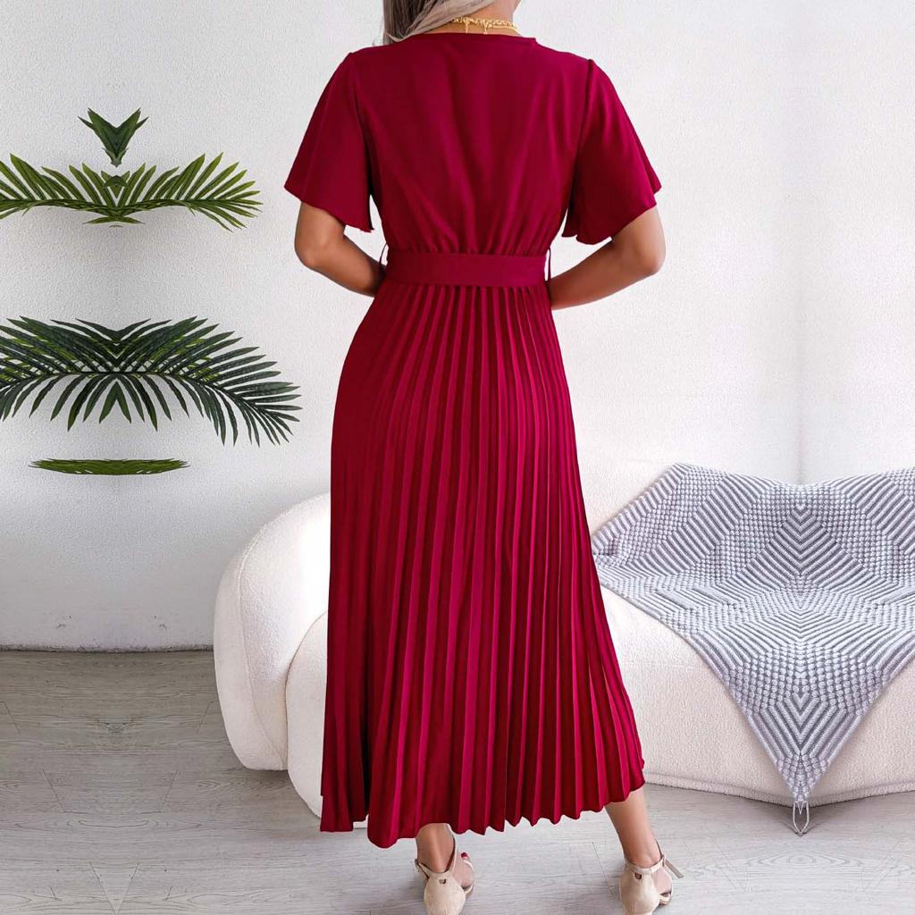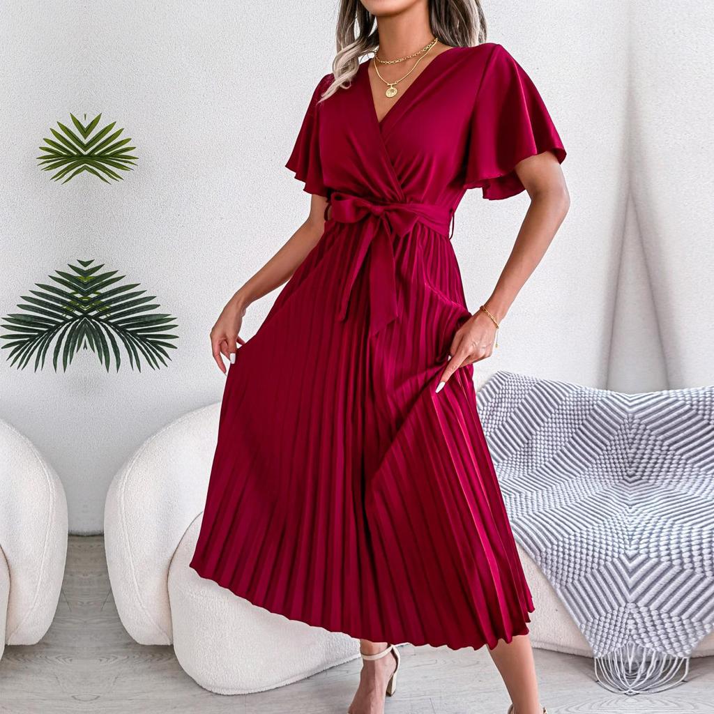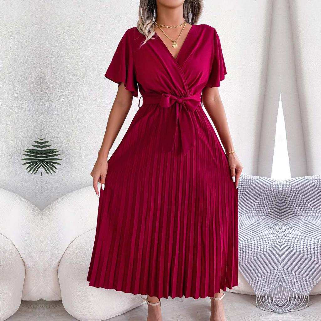Женское весенне-летнее темпераментное длинное платье с V-образным вырезом и коротким рукавом, однотонное плиссированное макси-платье S-XL