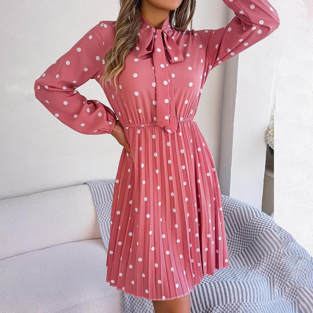 Женское осенне-зимнее темпераментное плиссированное платье в горошек с высокой талией и длинными рукавами