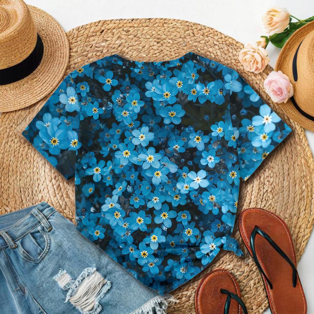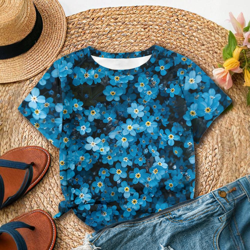 Летний топ с круглым вырезом и 3D-принтом синих цветов, модная повседневная женская футболка с коротким рукавом