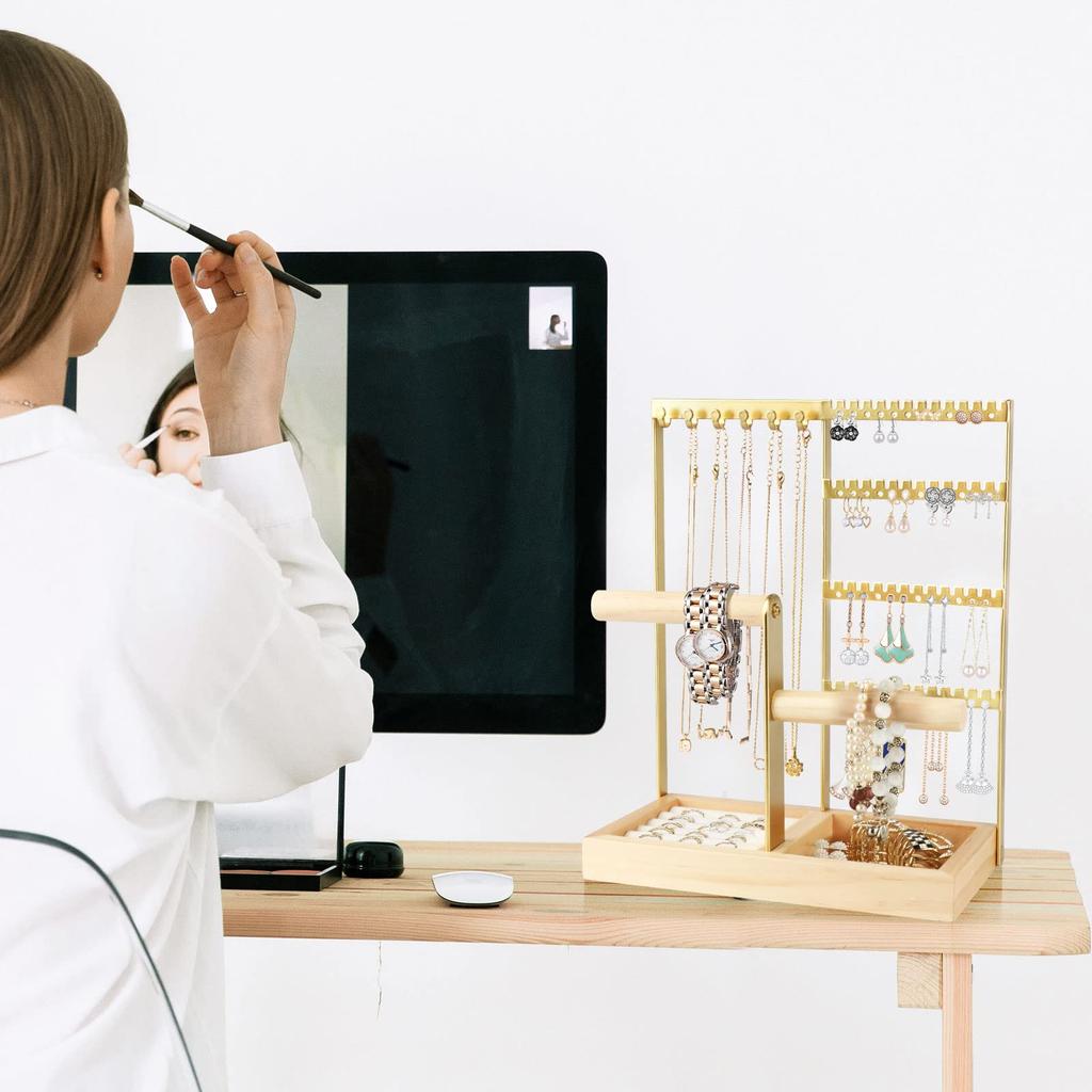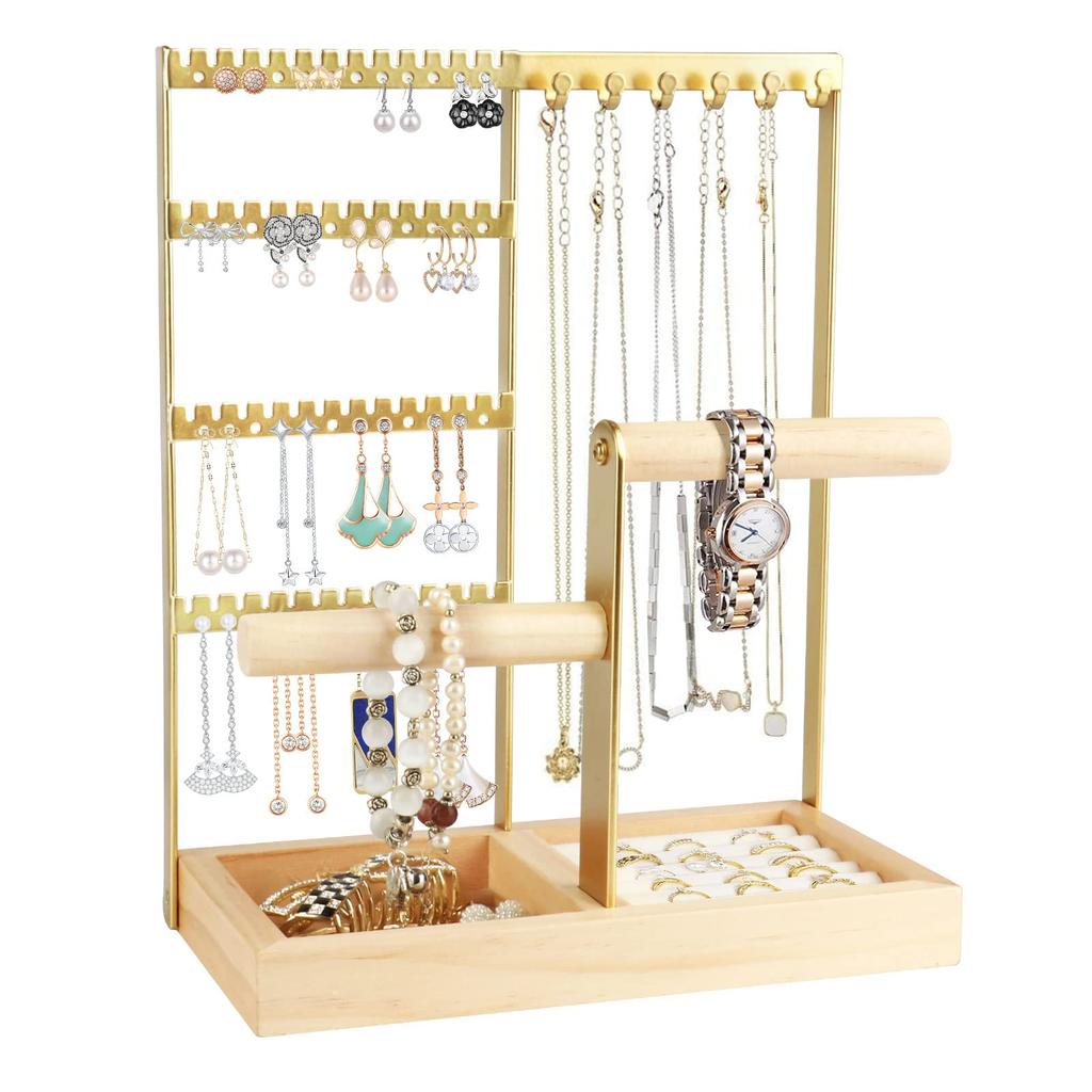 Прочная конструкция из железа и дерева: Эта подставка для украшений изготовлена из высококачественного железа и дерева, что придает ей простой и элегантный вид.. Он прочный и устойчивый к деформации, и может хранить тяжелые украшения без каких-либо проблем.. Он впишется в любой стиль интерьера и обеспечит вам решение для хранения, которое прослужит долго.
