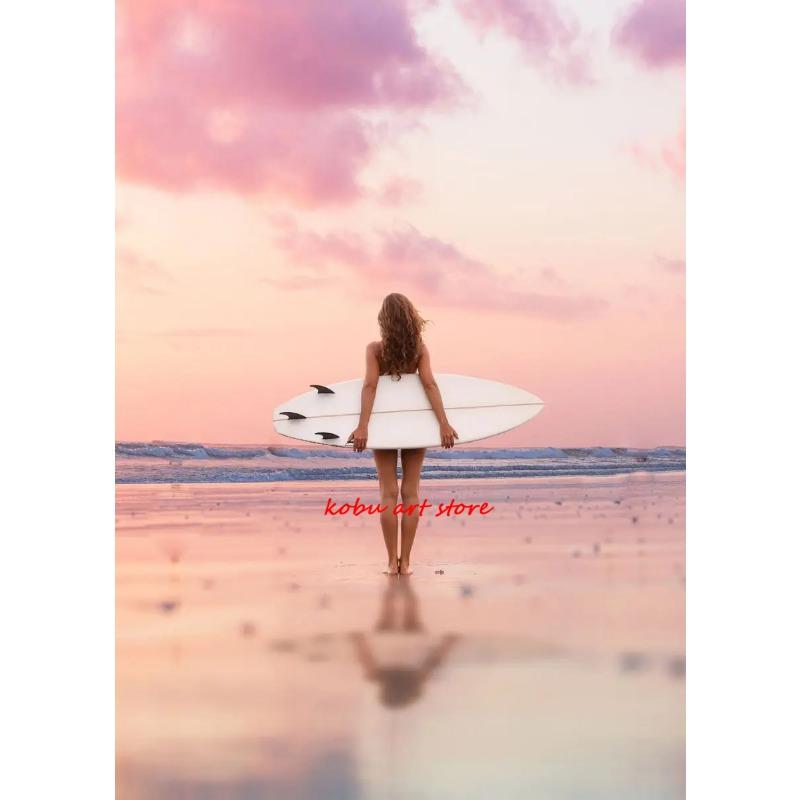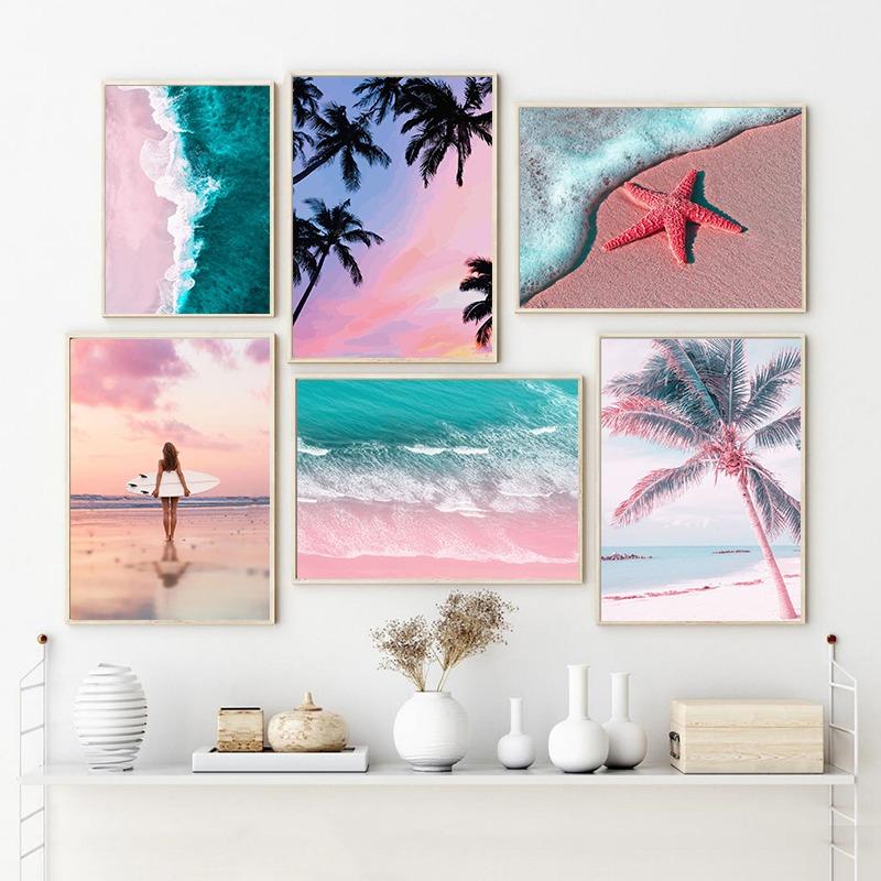 Розовый пляж Океанский пейзаж Холст Живопись Постеры Принты Серфинг Кокосовая пальма Скандинавское настенное искусство Картина для гостиной Домашний декор