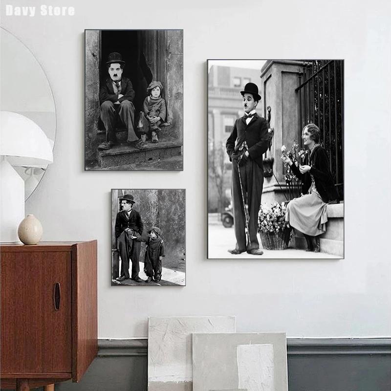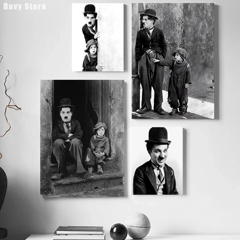 Черно-белый комедийный мастер Чарли Чаплин и мальчик Кинопостеры Холст Печатная картина Настенное искусство Картины Комната Домашний декор