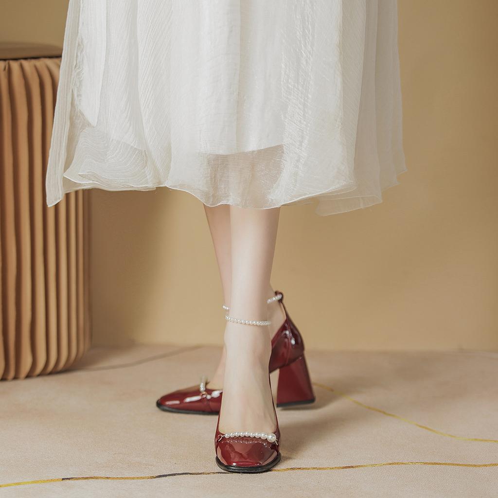 Весна и лето 2025 туфли на высоком каблуке для подружек невесты, не утомляющие ноги, толстый каблук, детские универсальные туфли-лодочки с квадратным носком и жемчужной цепочкой, женские