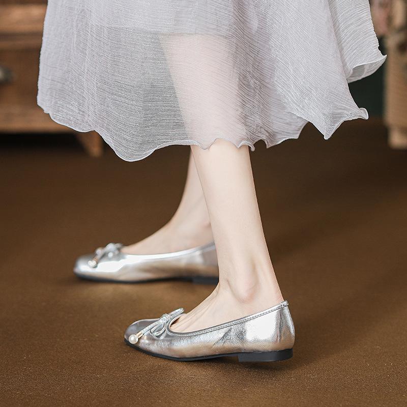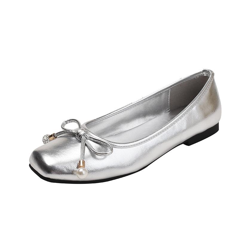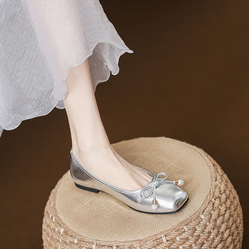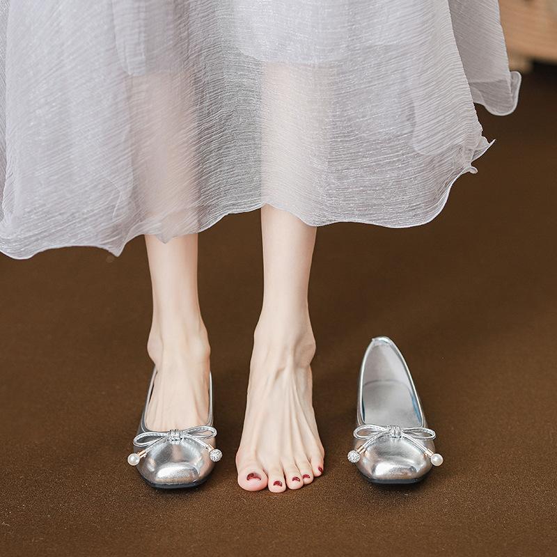 Французские элегантные туфли-балетки с квадратным носком и жемчугом женские 2025 новые с юбкой удобная мягкая подошва серебристые одинарные туфли балетки
