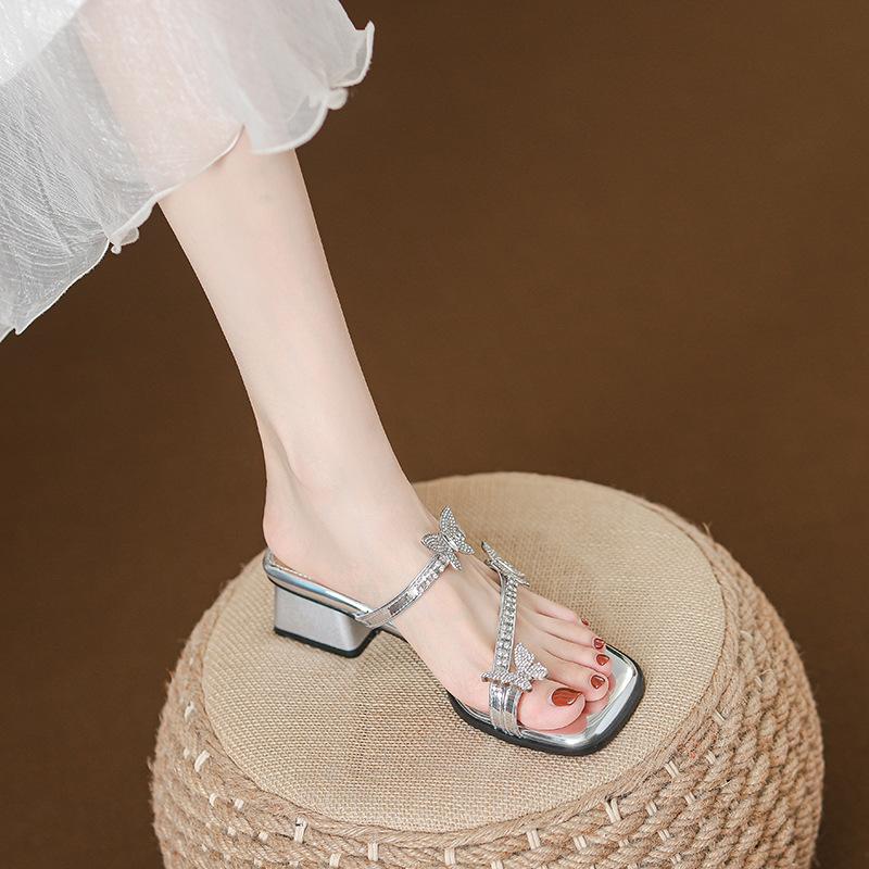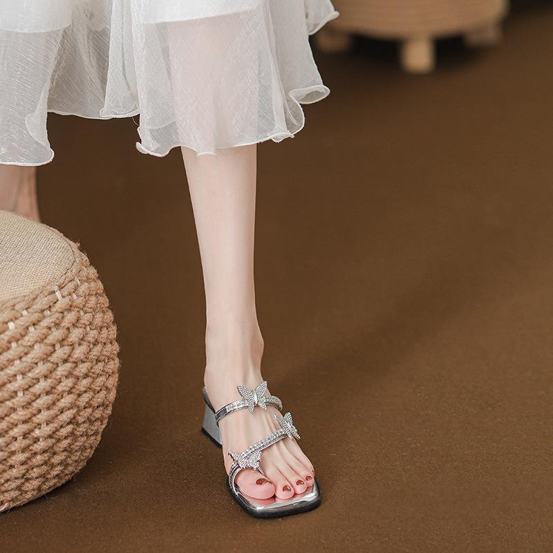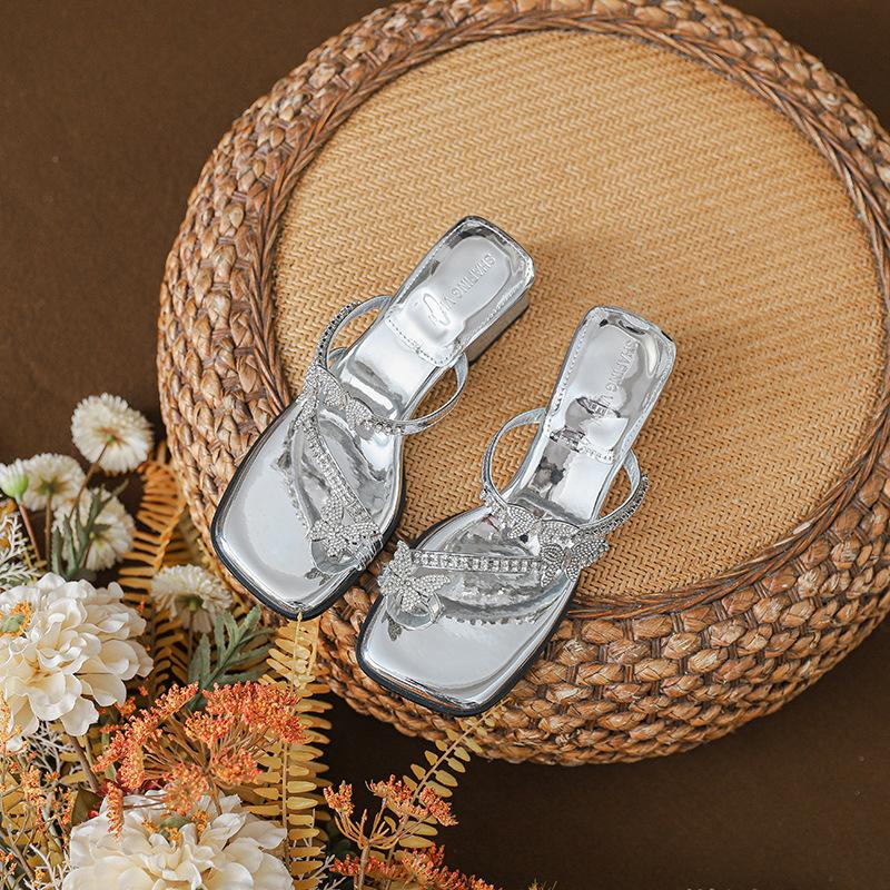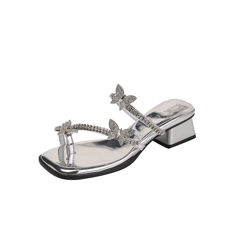 2025 Новые квадратные носки с серебристыми стразами и высоким толстым каблуком крутые шлепанцы детские премиальные летние