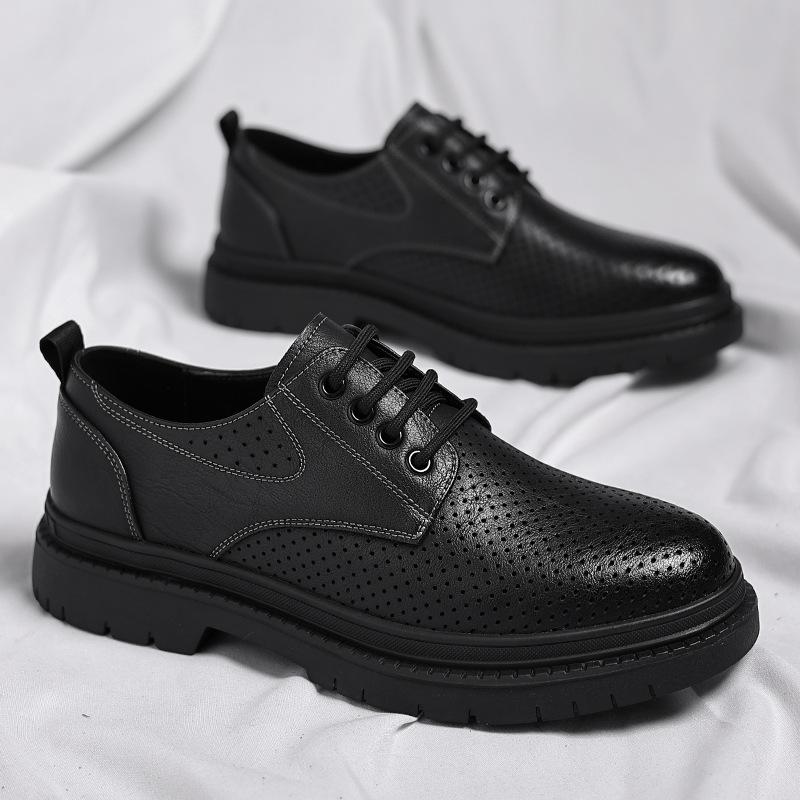 Кожаная обувь мужская летняя дышащая повседневная мужская обувь тонкая полая черная британский тренд 2025 — купить товар онлайн с бесплатной доставкой по всему миру!