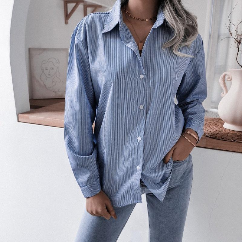 Полосатая женская блузка с длинными рукавами, весна-лето, рубашка с отложным воротником, однобортная, со свободной талией, шикарный карман, M-4XL — купить товар онлайн с бесплатной доставкой по всему миру!