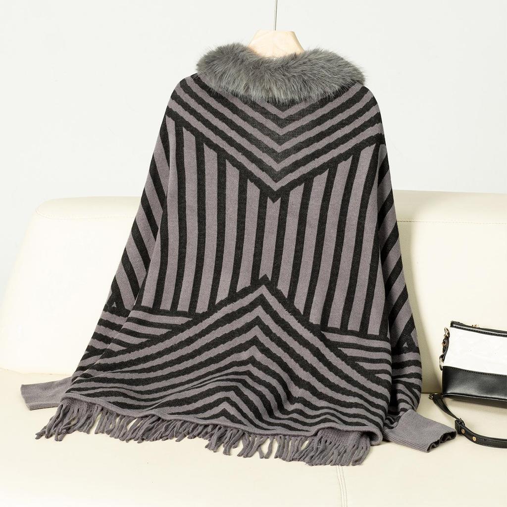 Осень и зима Женский полосатый свободный рукав летучая мышь плащ с перекрестными краями кардиган трикотаж свитер с воротником-стойкой