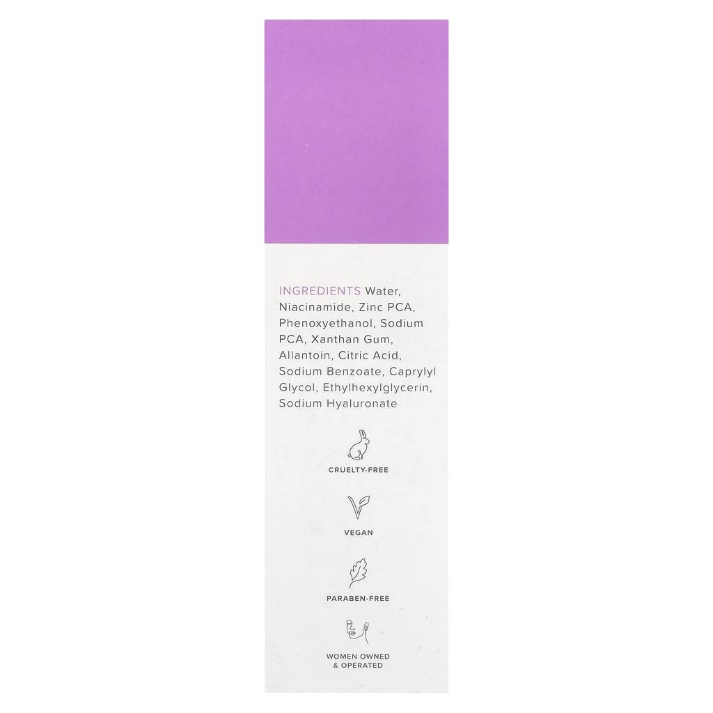 Ингредиенты: очищенная вода, ниацинамид, цинк PCA, феноксиэтанол, натрий PCA, ксантановая камедь, аллантоин, лимонная кислота, бензоат натрия, каприлилгликоль, этилгексилглицерин, гиалуронат натрия.