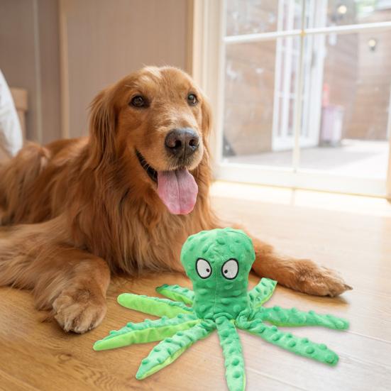 Прочная конструкция из полиэстера: Эта плюшевая игрушка для собак в виде осьминога, изготовленная из высококачественного полиэстера, выдерживает умеренное жевание, обеспечивая вашему пушистому другу длительную игру.